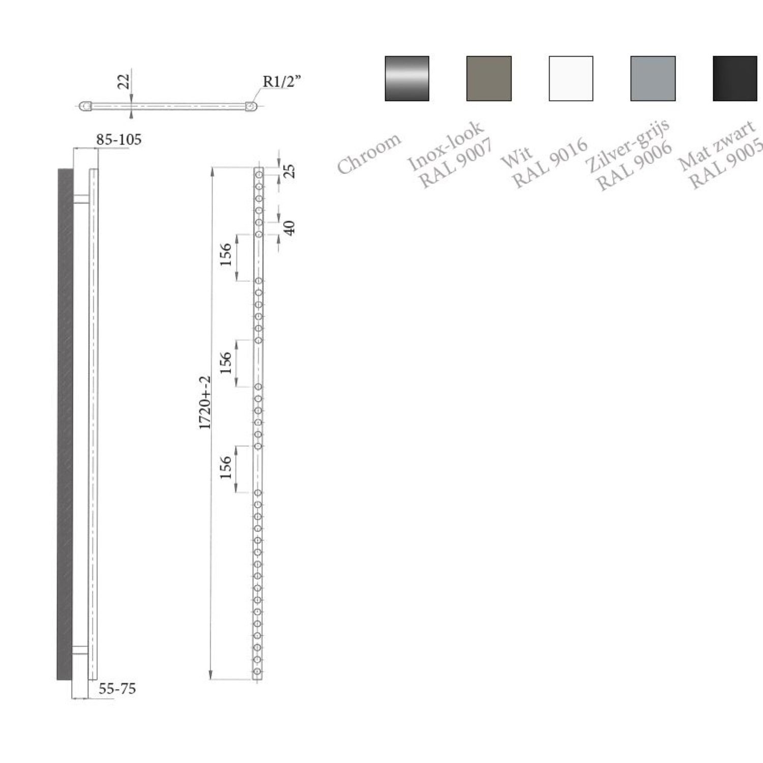 De radiator wordt geleverd inclusief ophanging, automatische ontluchter, 4 montage beugels en thermostaat. (de locatie van de thermostaat is rechtsonder, op aanvraag ook linksonder leverbaar). De afmeting van de radiator is 172 cm hoog, 45 cm breed en hij wordt geleverd in een chromen kleur, met een chroom kleurige thermostaat.