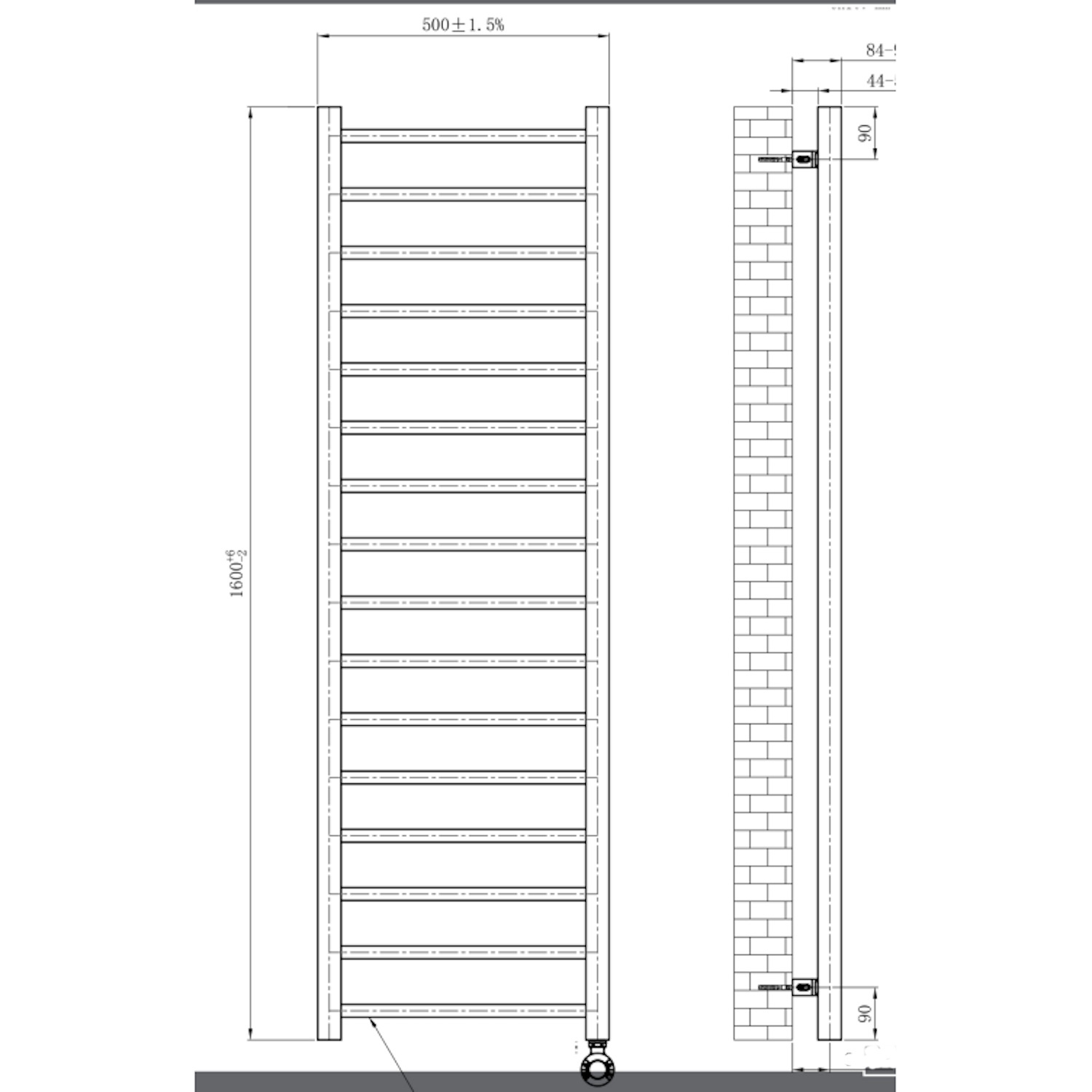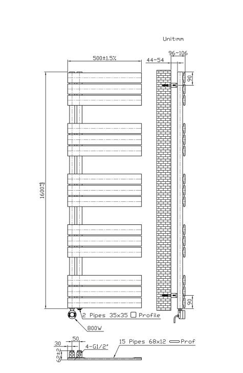 De radiator heeft een hoogte van 160 cm en een breedte van 50 cm. De radiator heeft een wattage van 755 en is verkrijgbaar in een mat zwart kleur.