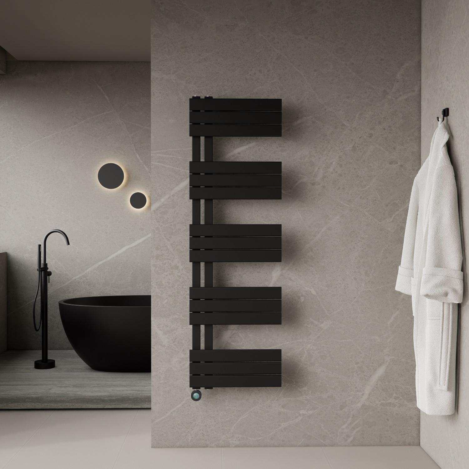 Ideaal voor in de badkamer deze Handdoekradiator, de radiator kan aan de linkerkant aangesloten worden. De radiator van Boss & Wessing uit de Russ serie past met zijn strakke design en mooie Zwarte kleur goed binnen uw badkamer. Perfect om uw handdoeken kort op te warmen en een aangename temperatuur in uw badkamer te creëren. Wat ook ontzettend handig is aan deze radiator is dat hij elektrisch is.