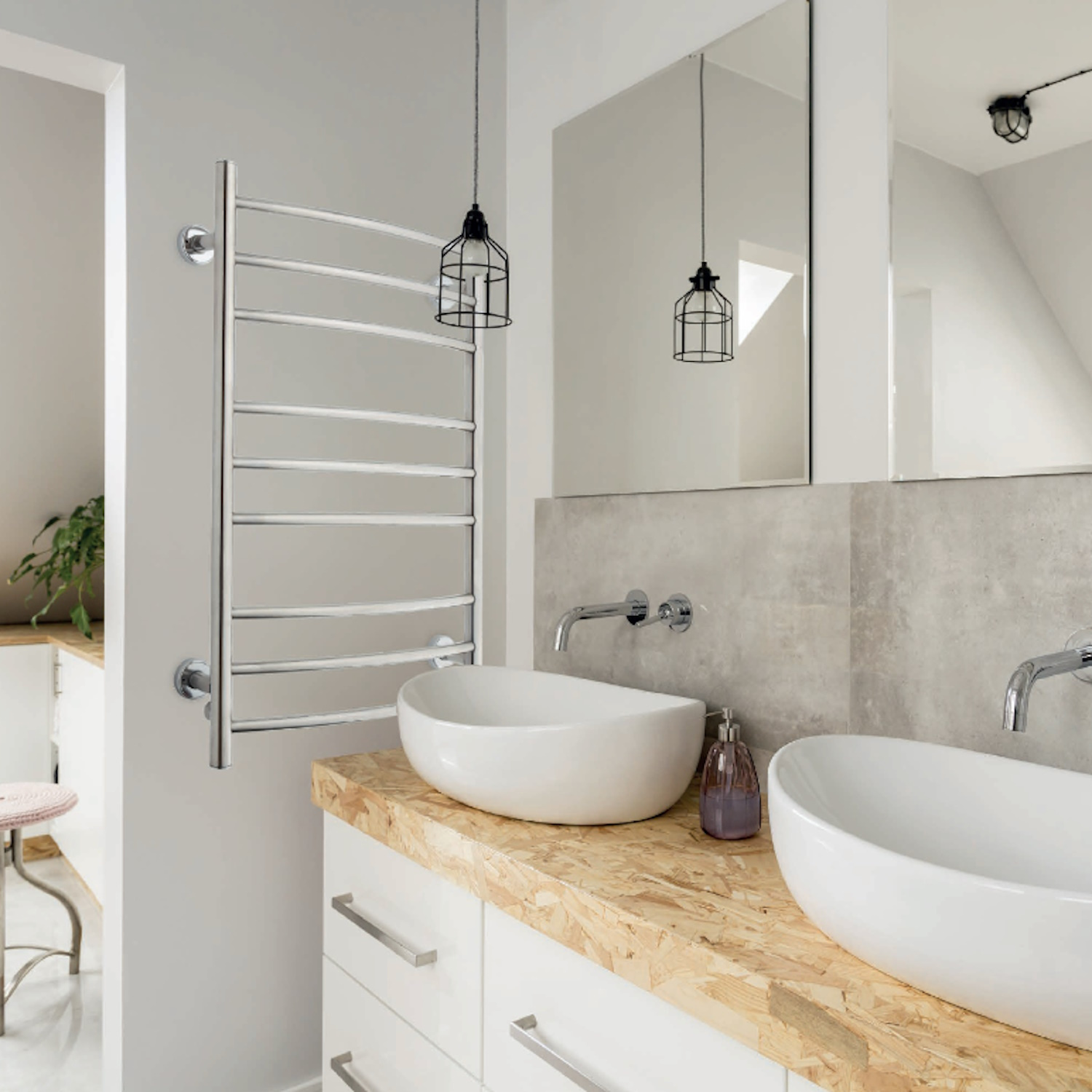 Bent u op zoek naar een strakke, elektrische radiator voor in uw badkamer? Dan is deze radiator van TVS uit de serie Eldo 9 L echt iets voor u. Deze radiator is RVS van kleur. Hij is 86 cm hoog en 53 cm breed. De radiator bestaat uit 2 verticale, ronde buizen en 3 setjes van 3 horizontale, ronde buizen. Aan de achterkant van de radiator zitten 4 bevestigingspunten waardoor u hem aan de muur kunt hangen. Deze radiator heeft een ingebouwde thermostaat die de temperatuur tussen de 45 en 55 graden houdt. Door de timer functie hoeft u de radiator niet meer uit te zetten, maar gaat dit automatisch na 2 of 4 uur. Dit kunt u zelf instellen. Hij heeft een capaciteit van 120 Watt. Door zijn strakke design past hij goed in elke moderne badkamer. Met deze radiator heeft u na elke keer douchen de luxe van een warme handdoek.