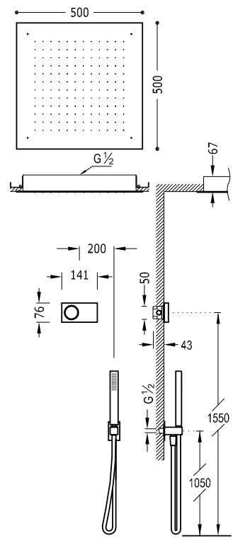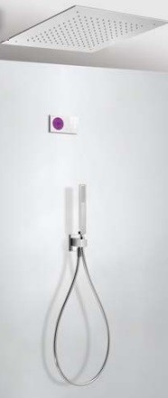 Prachtige elektronische douchethermostaat set bestaande uit een zeer uitgebreide elektrische douchthermostaat, antikalk hoofd-regenddouche vervaardigd uit RVS, een antikalk handdouche met opsteekgarnituur die bevestigd wordt aan de muur en een satijn slang.