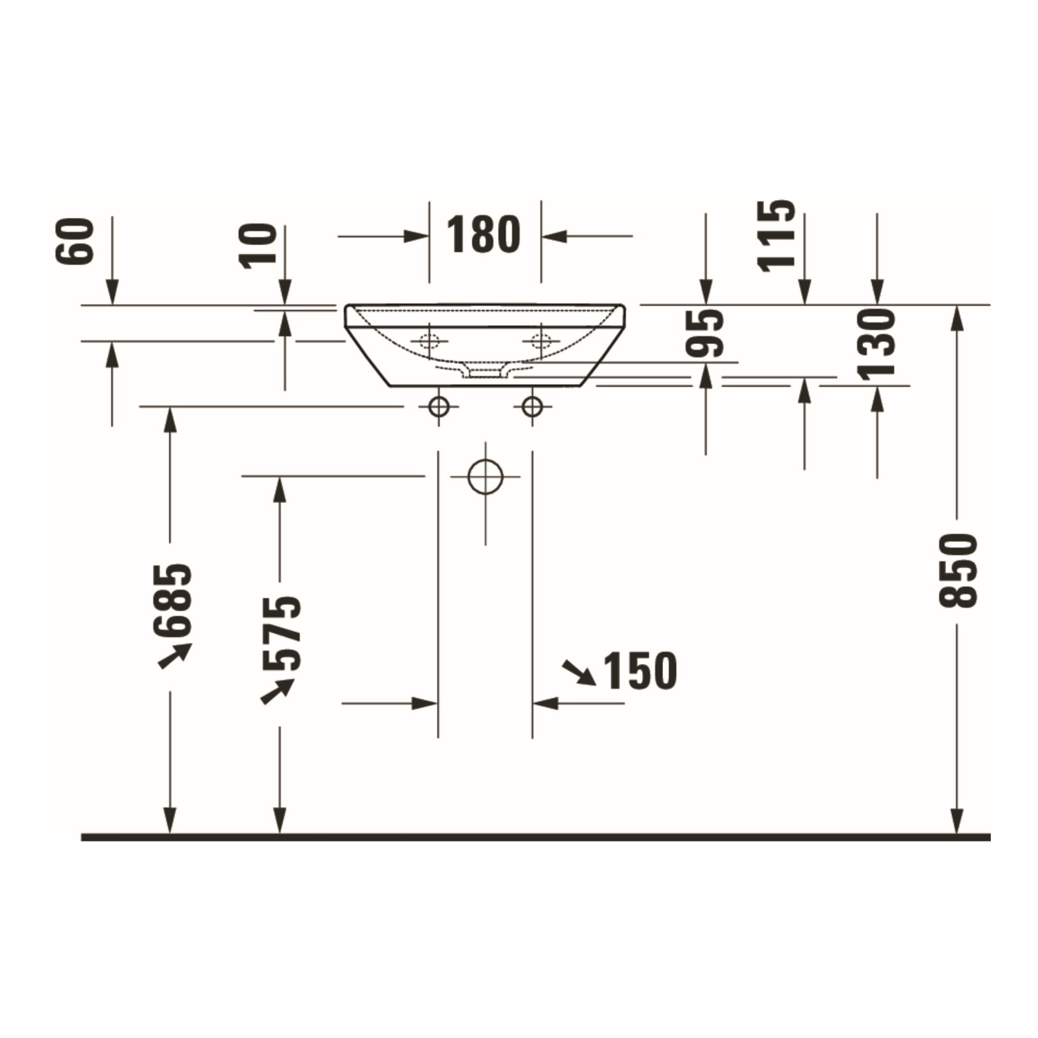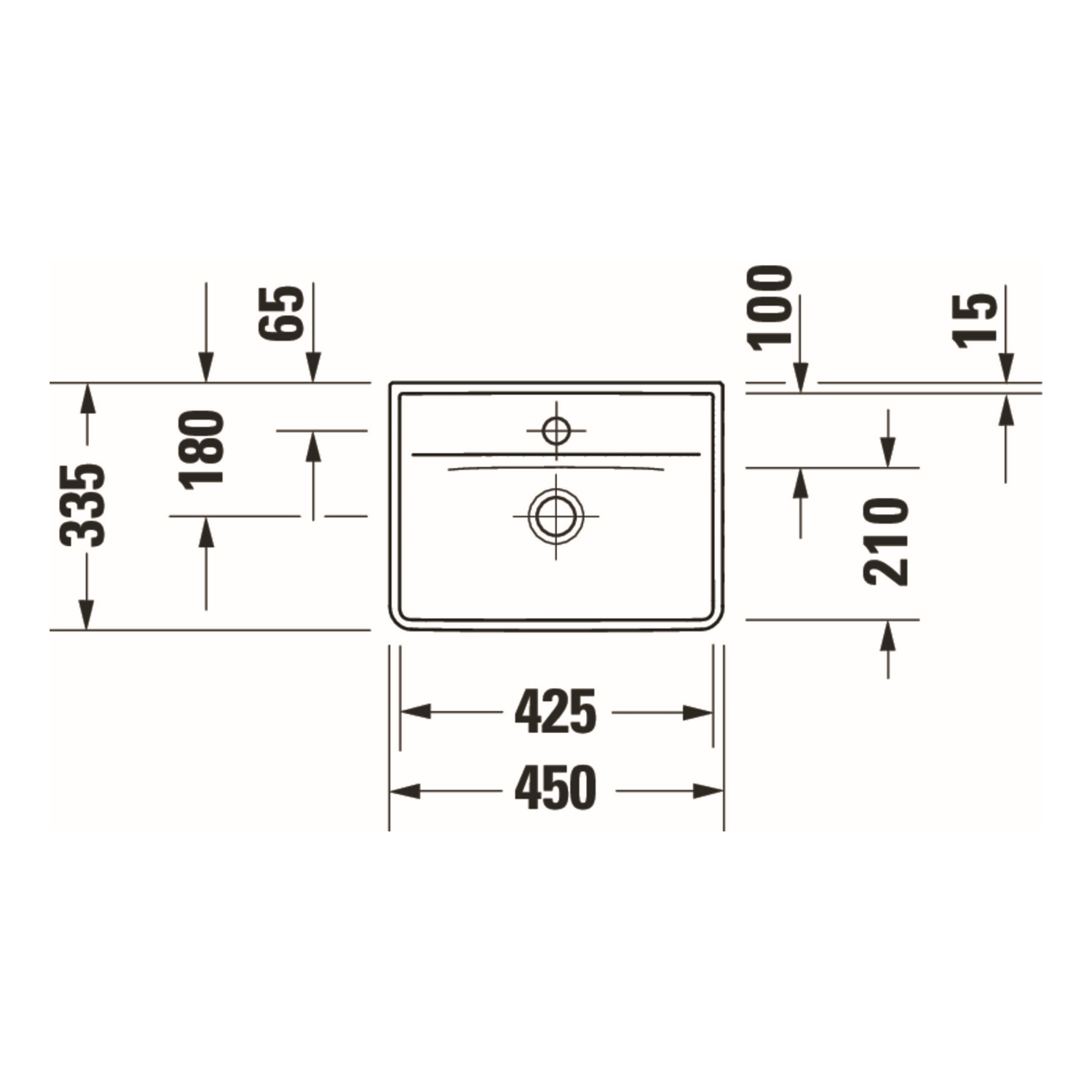 De fontein heeft een rechthoekige vorm en heeft een frisse witte kleur. De diepte van de fontein is 33.5 cm, de breedte 45 cm en het heeft een hoogte van 13 cm. In het midden van de fontein bevindt zich de kraangat.