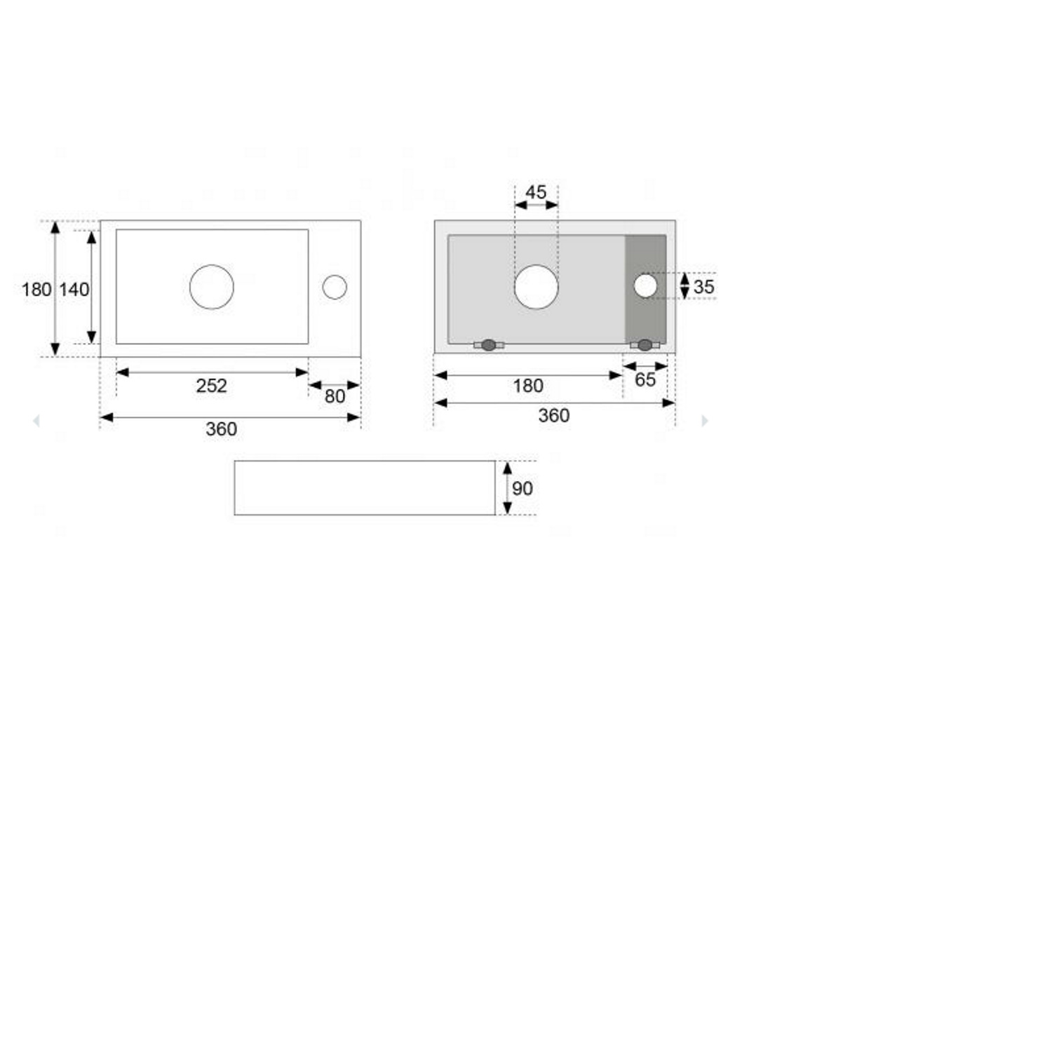 De fontein beschikt aan de rechterkant over een kraangat. De fontein is 36 cm breed, 18 cm diep en 9 cm hoog. Het wordt verder zonder kraan en afvoer geleverd.