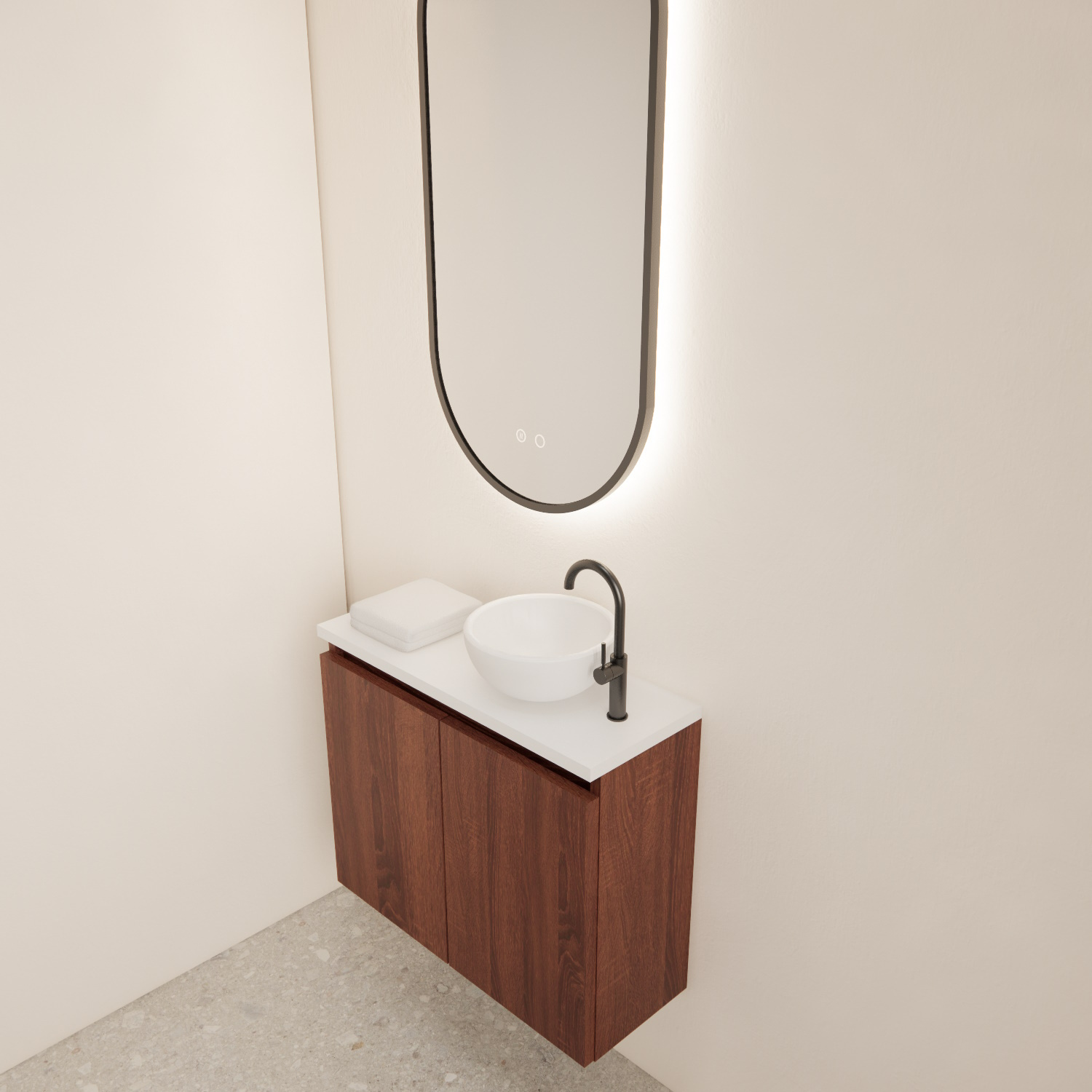 De fonteinkast is voorzien van 2 deuren die door middel van een softclose systeem langzaam dicht zullen vallen. De fonteinkast is daarnaast ook niet voorzien van een greep, deze zit namelijk geïntegreerd in de kast. Onderaan de pagina kunt u een mini waskom bijbestellen mocht u dit willen.