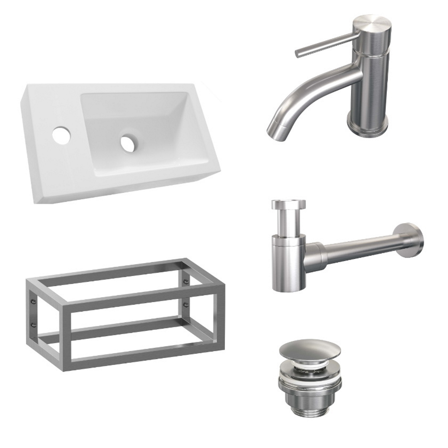 Het frame is gemaakt van hoogwaardig RVS zodat hij het gewicht van de fonteinbak ook kan houden. De kraan, sifon en afvoerplug zijn van ditzelfde materiaal gemaakt en deze worden bijgeleverd. Ook wordt er een set bevestigingsmateriaal meegeleverd.