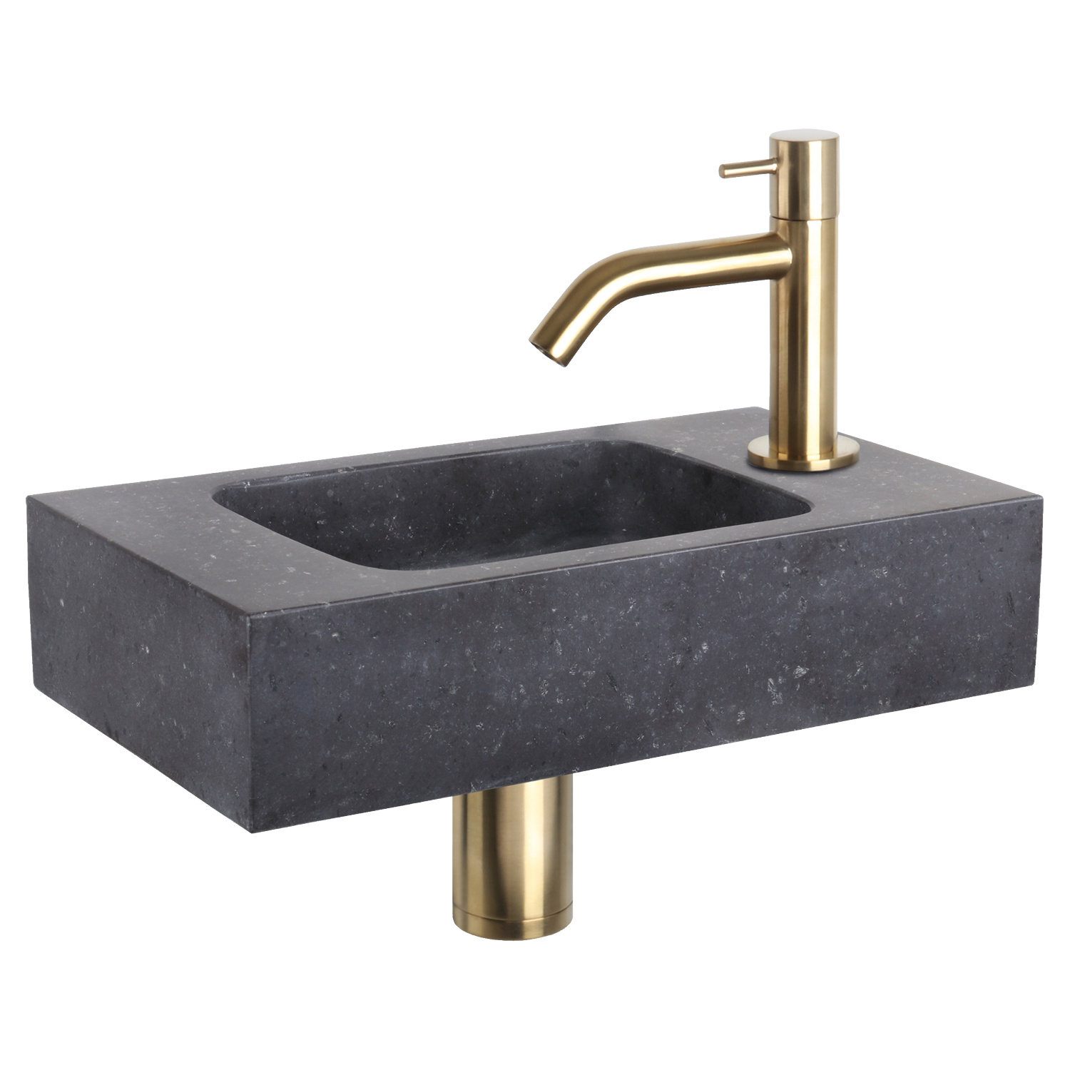 Deze combinatie bestaat uit het strak afgewerkte bombai black fontein natuursteen met mat gouden gebogen koudwaterkraan, afvoerplug en sifon. Het kraangat zit aan de rechterkant van deze fontein. Het natuursteen is een natuurlijk materiaal wat een zeer luxe uitstraling.