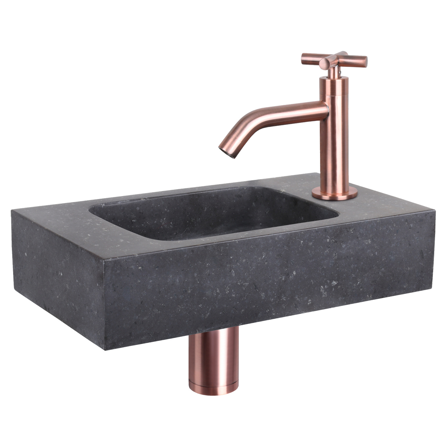 Deze combinatie bestaat uit het strak afgewerkte bombai black fontein natuursteen met rood kopere gebogen kruis koudwaterkraan, afvoerplug en sifon. Het kraangat zit aan de rechterkant van deze fontein. Het natuursteen is een natuurlijk materiaal wat een zeer luxe uitstraling.