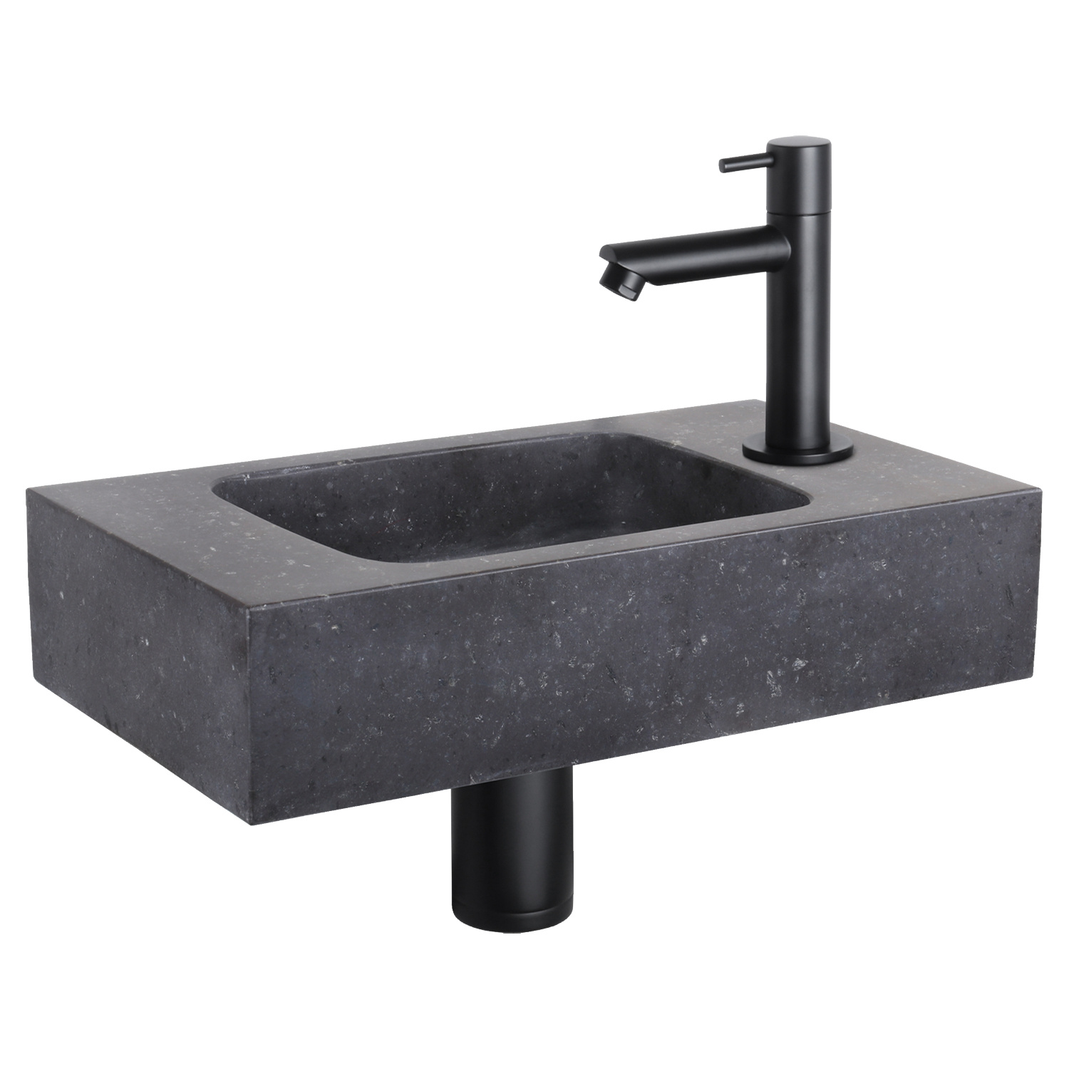 Deze combinatie bestaat uit het strak afgewerkte bombai black fontein natuursteen met mat zwarte rechte koudwaterkraan, afvoerplug en sifon. Het kraangat zit aan de rechterkant van deze fontein. Het natuursteen is een natuurlijk materiaal wat een zeer luxe uitstraling.