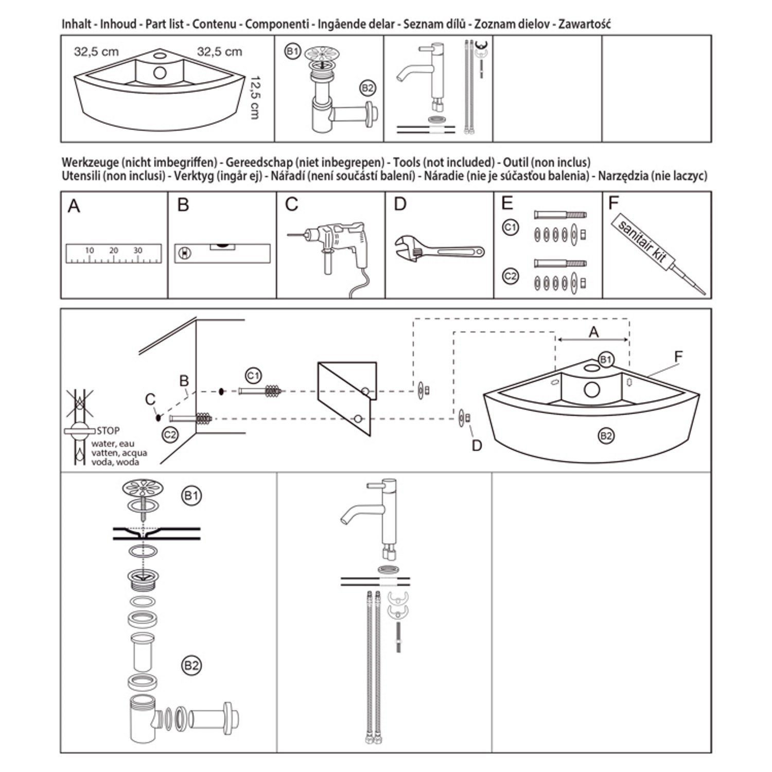 De fontein is gemaakt van keramiek, heeft de witte keramiek kleur en een kwartrond vorm. De kraan is gemaakt van RVS.