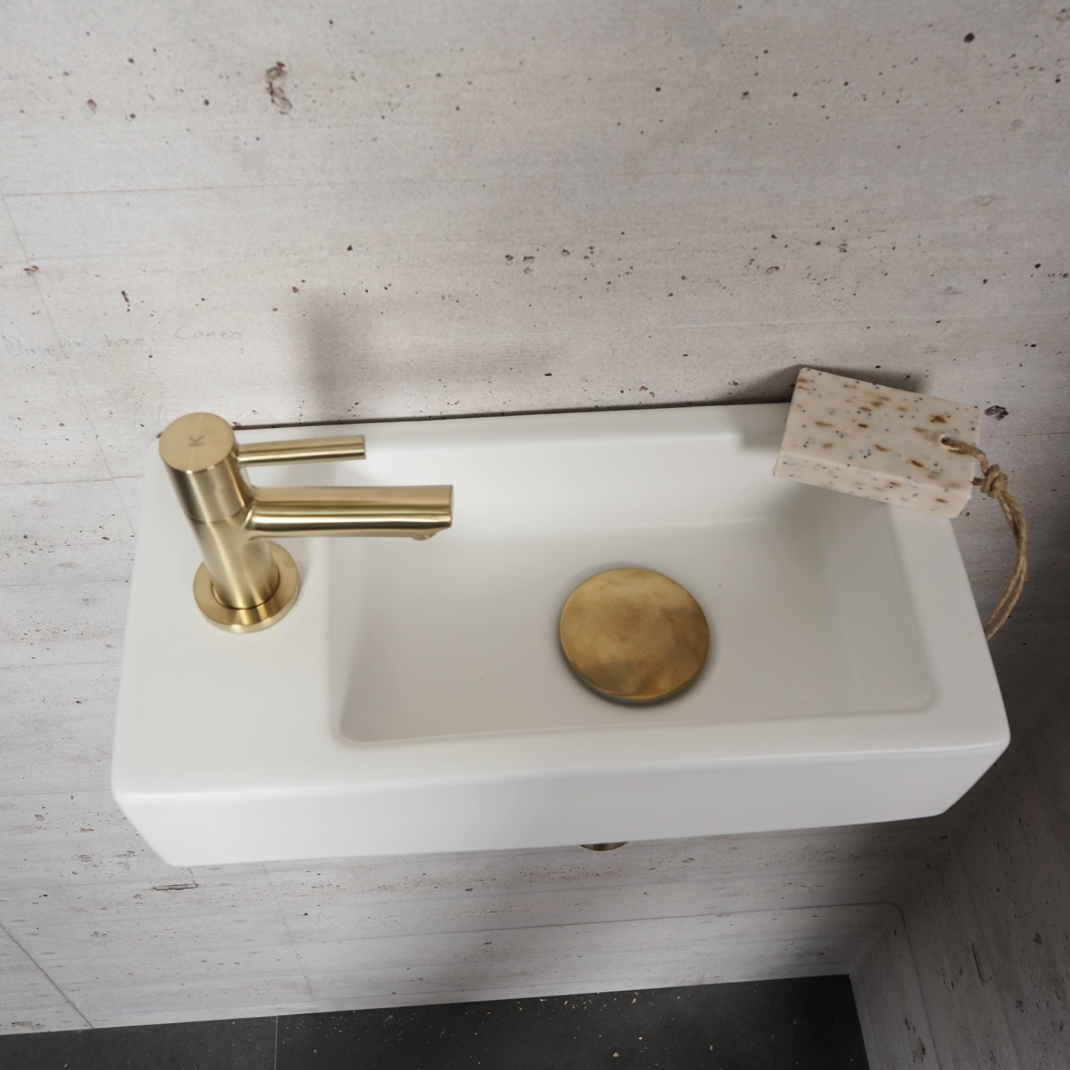 Een complete moderne fonteinset wat u een mooi prijsvoordeel oplevert. De Mat Witte Fontein set Wiesbaden Color is gecombineerd met een Messing (Gouden geborstelde Look) kraan. De set word compleet gemaakt met een Messing goud clickwaste en sifon.