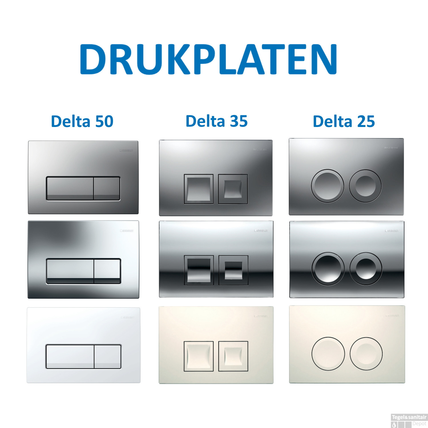 Er zijn 3 verschillende uitvoeringen van de Delta drukplaat. De Delta 25, 35 en 50. Elke uitvoering is verkrijgbaar in verschillende kleuren. De bedieningsplaten zijn voorzien van DualFlush. DualFlush betekent dat u kunt kiezen uit een spoeling vanuit de kleine en de grote knop. Met de grote knop wordt er gemiddeld 7,5 liter water gebruikt en met de kleine knop is dat 3 liter spoelwater. U kunt op die manier water besparen. Goed voor het milieu en voor de portemonnee.