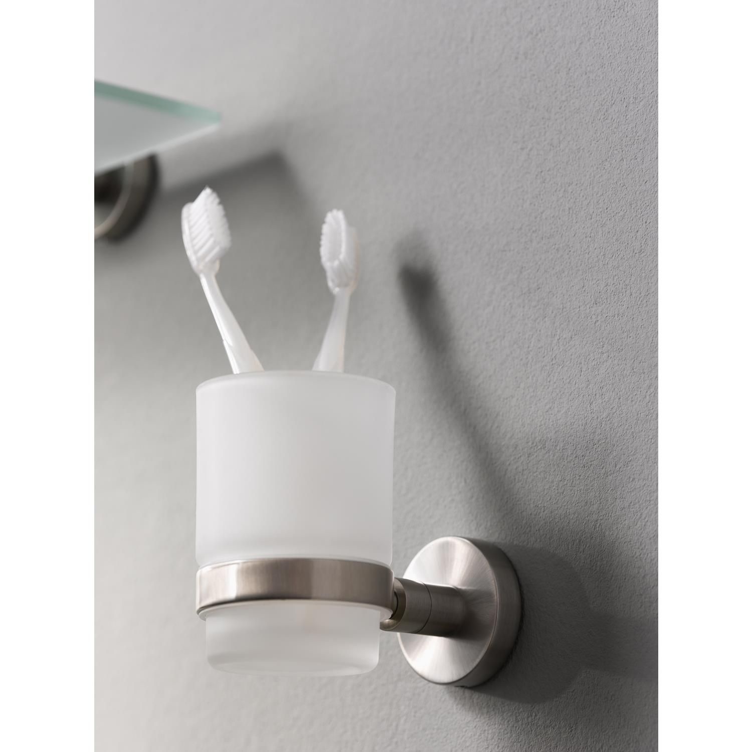 Deze stijlvolle beker van wit, mat glas zit altijd stevig in de houder: dankzij de zwarte, rubberen ring klemt u hem moeiteloos vast. Bovendien is de beker makkelijk uitneembaar. De beker is getest en voldoet aan de Europese normen voor artikelen die met voedsel in aanraking komen. Dit betekent dat de beker geen gevaarlijke stoffen afgeeft en dat u er gegarandeerd veilig uit kunt drinken. Dit glas kunt u gebruiken om uit te drinken, maar ook om eventueel uw tandenborstels in te bewaren.