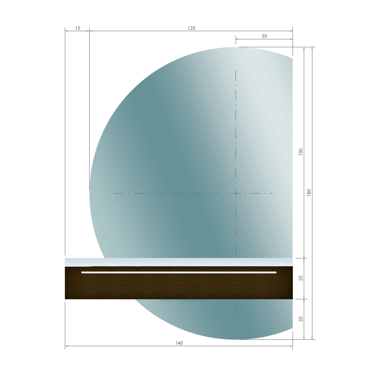 De spiegel is 125 cm breed en 180 cm hoog. De spiegel is 3 mm dik. Als u de spiegel bij de onderkast van Calypso plaatst, zal de spiegel onder het meubel verder lopen.