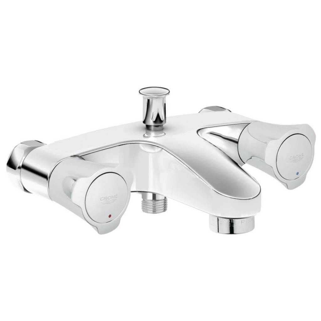 Verchroomde badkraan Costa L van Grohe. Deze badkraan is warmte geïsoleerd, heeft een automatische bad/douche omstelling. Voorzien van een gegoten uitloop met mousseur en 1/2 inch doucheslang aansluiting, zonder koppelingen.