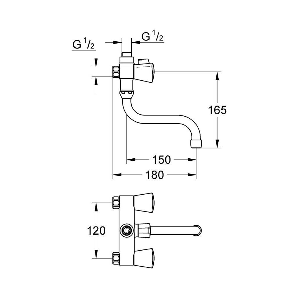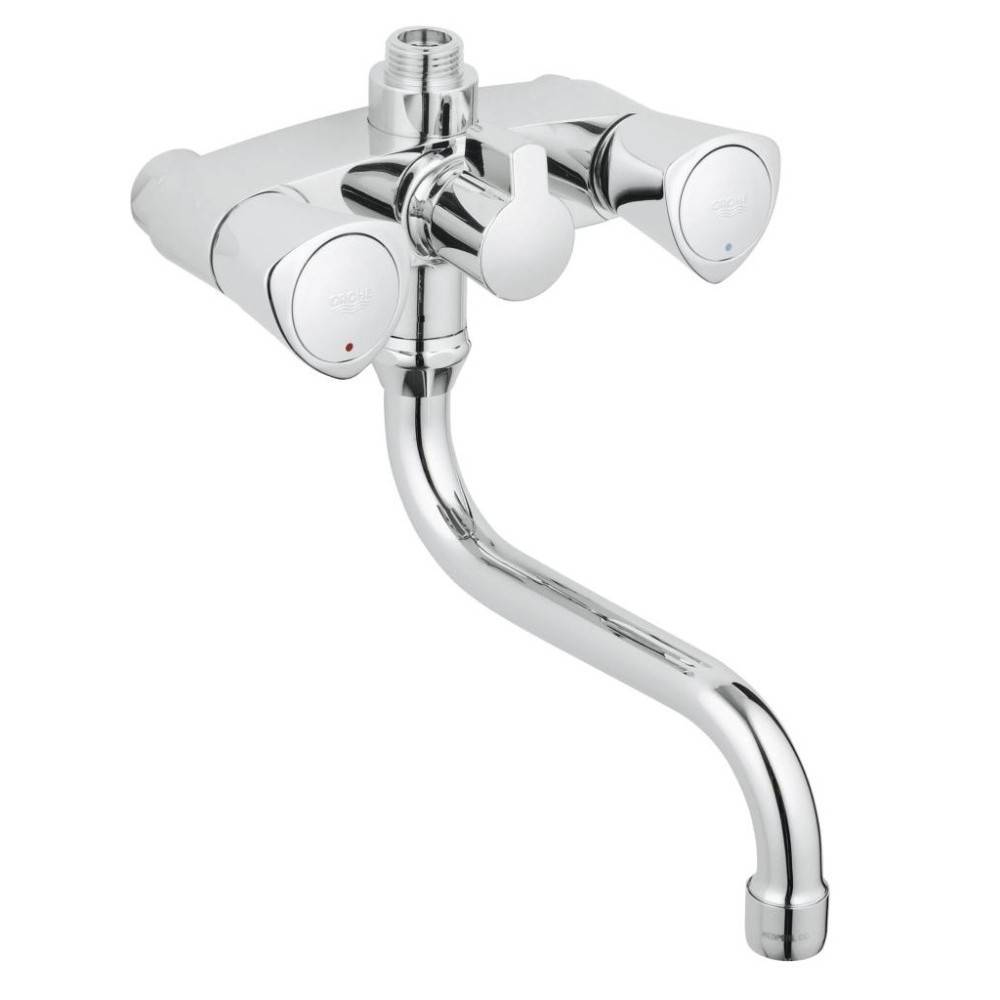 Costa-S douchekraan van Grohe. Deze douchekraan beschikt over een omstelling, een draaibare buisuitloop en heeft metalen grepen. Verder heeft deze douchekraan een keramisch bovendeel.