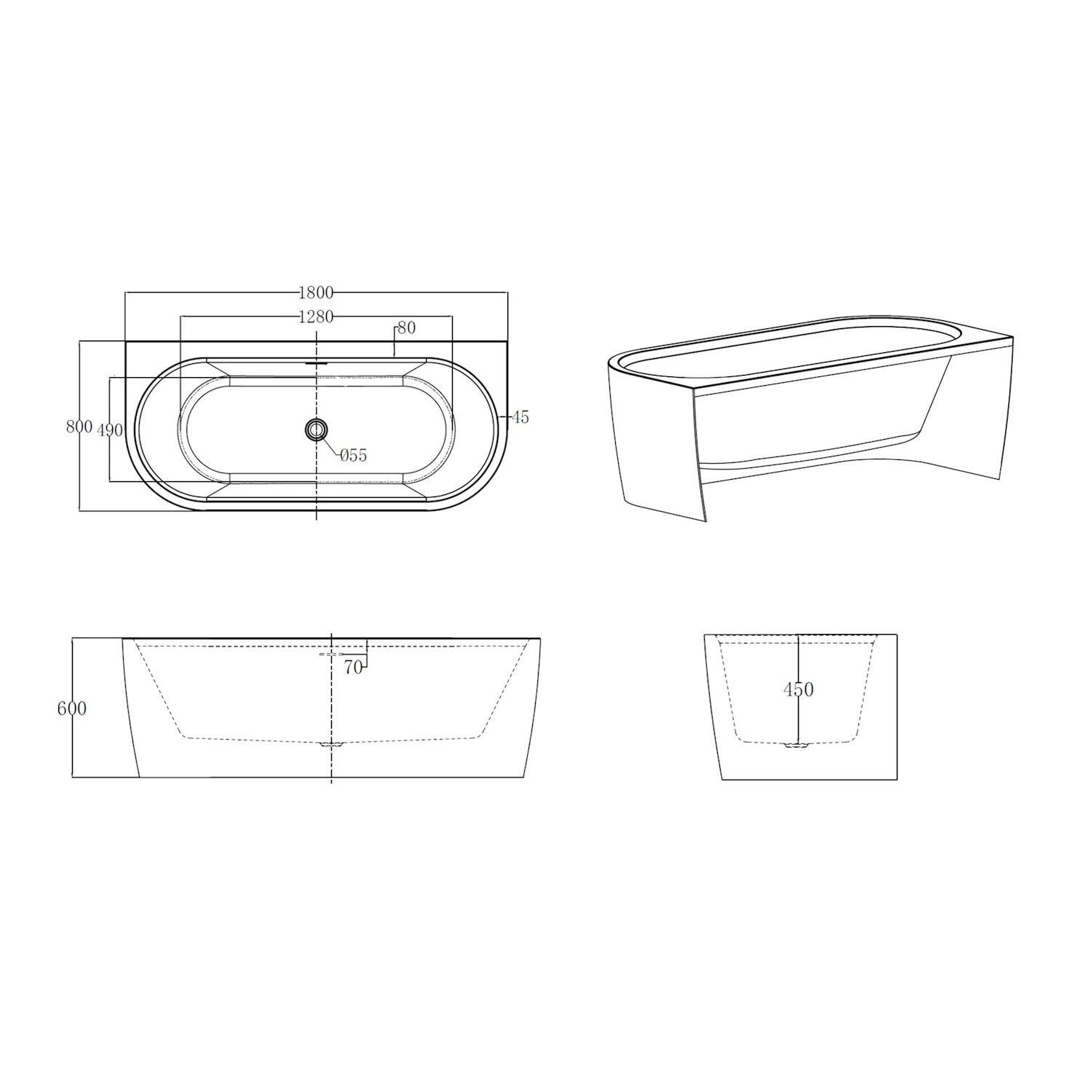 Het half vrijstaande bad is voorzien van een overloop en er wordt een sifon meegeleverd, net zoals de verstelbare poten. De naadafwerking van dit bad is naadloos, hierdoor zult u geen randen zien. De achterkant van dit half vrijstaande bad is open, met dit gedeelte wordt het bad tegen de muur geplaatst.