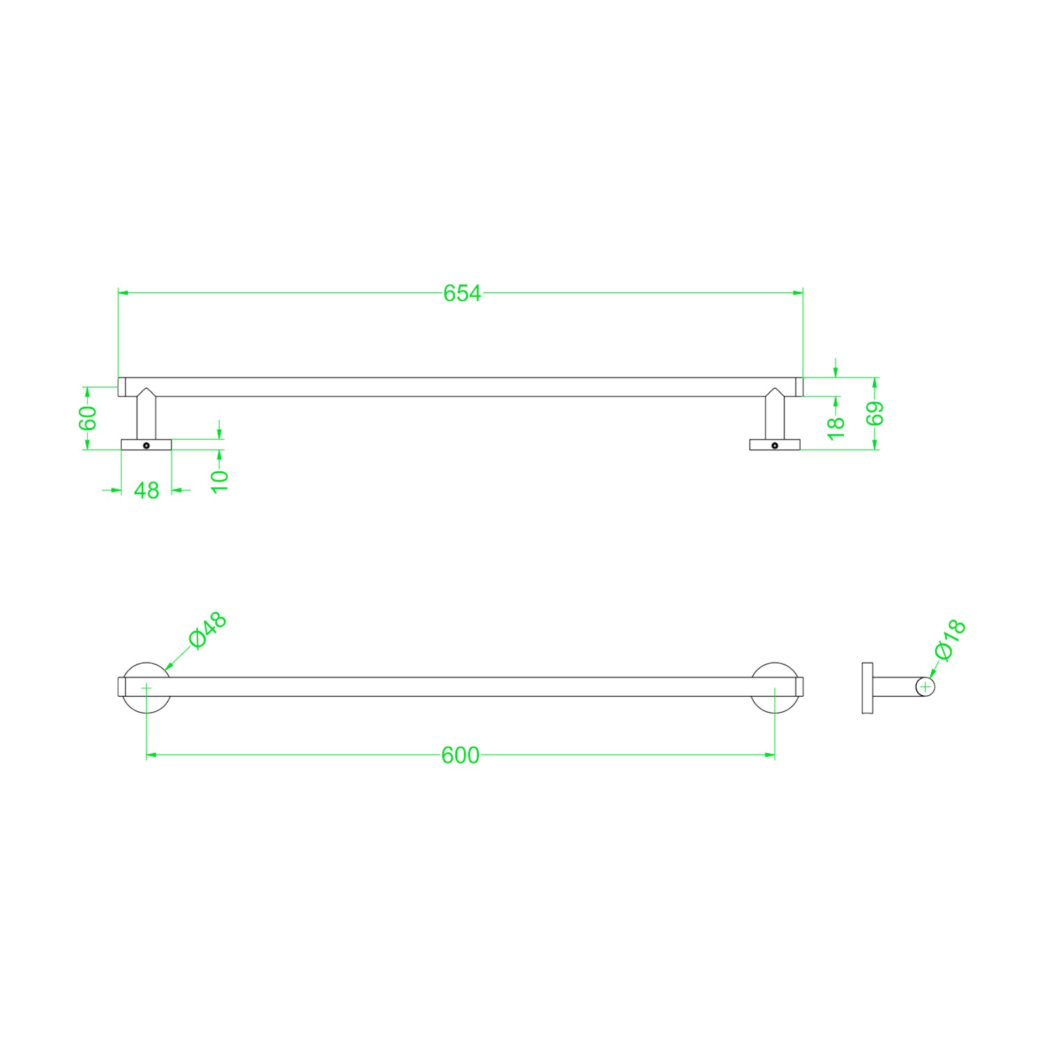 Het handdoekenrek heeft een breedte van 60cm en een diepte van 6,9 cm.