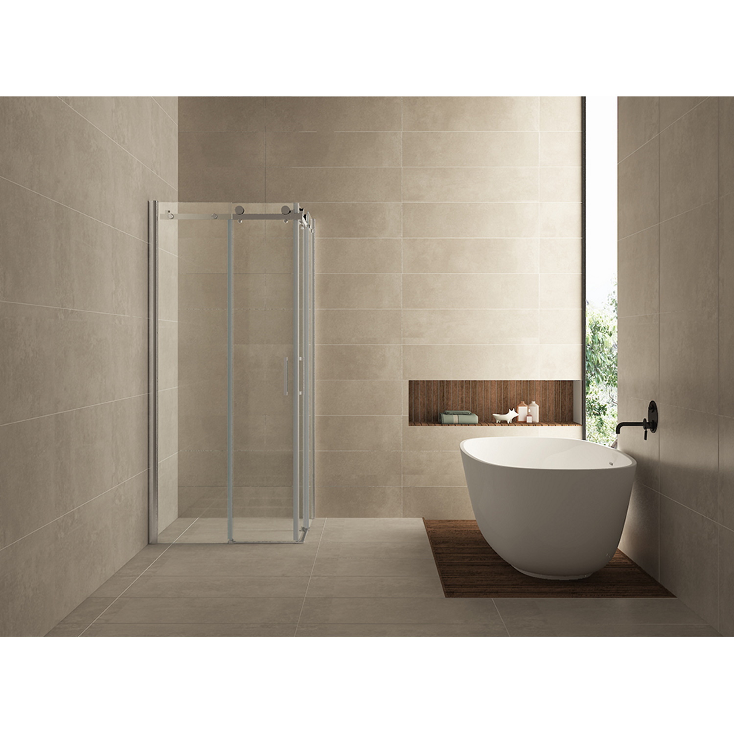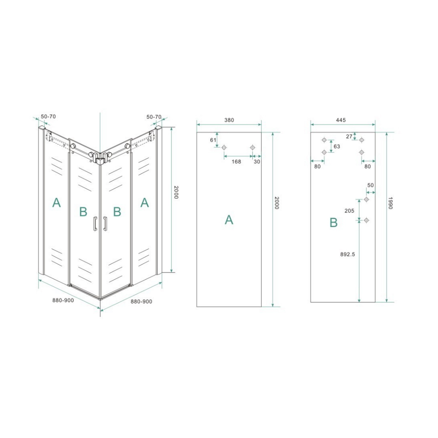 De cabine wordt opgehangen doormiddel van grote wielen die gemaakt zijn van roestvrij staal. Bij dit product worden twee chromen wandprofielen geleverd welke aan beide zijden 20 mm verstelbaar zijn.