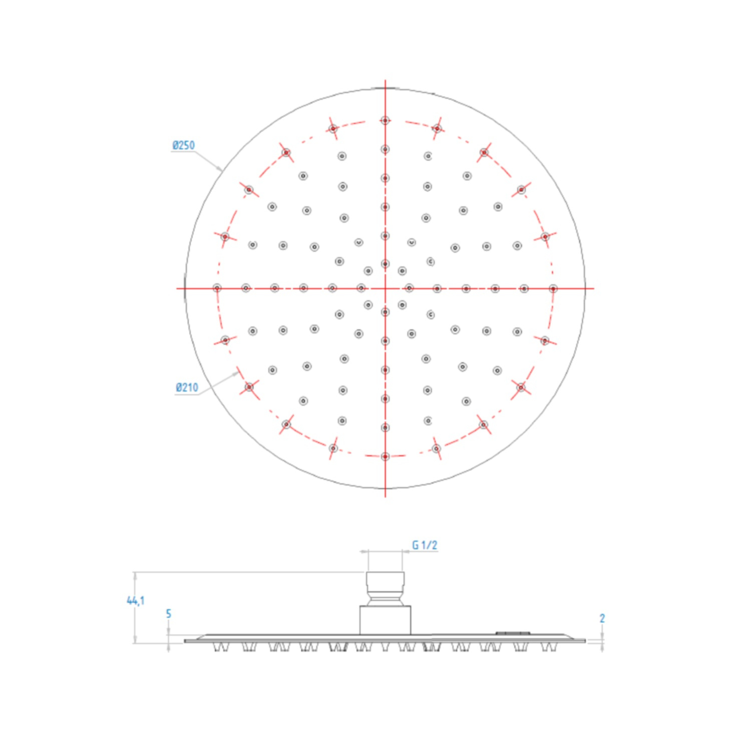 De douchekop heeft een diameter van 25 cm. De spuitgaten betrekken een oppervlakte van 21 cm in diameter. Het aansluitpunt van de douchekop is 1/2".