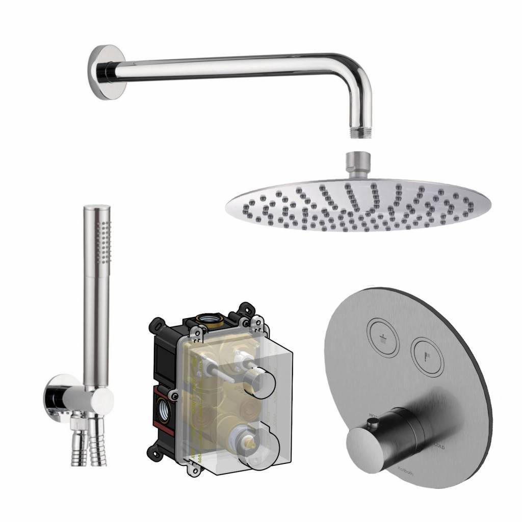 Een complete regendoucheset met alles er op en er aan! De set bestaat uit een muuruitloop met standaard een ronde regendouche van 20cm breed. U heeft de mogelijkheid met een meerprijs voor een 30 of 40cm brede hoofddouche. Daarnaast zit er een inbouw thermostaatkraan met afbouwdeel bij en een handdoucheset bestaande uit een handdouche, doucheslang en handdouchehouder.