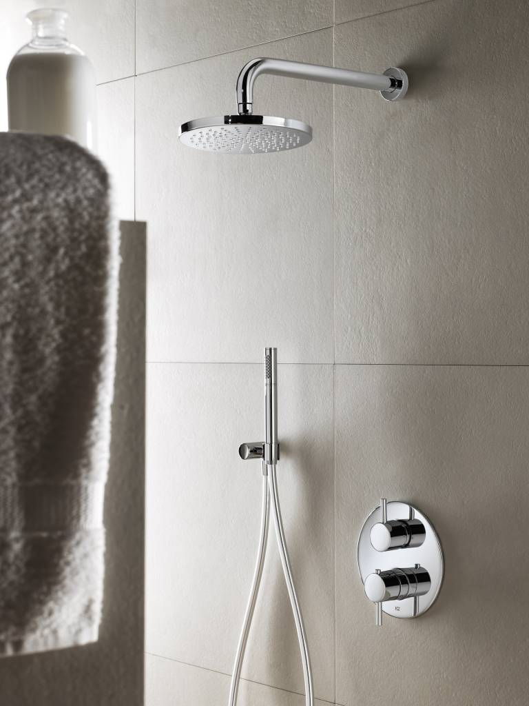 - Bevestiging hoofddouche: wandarm of plafondbuis