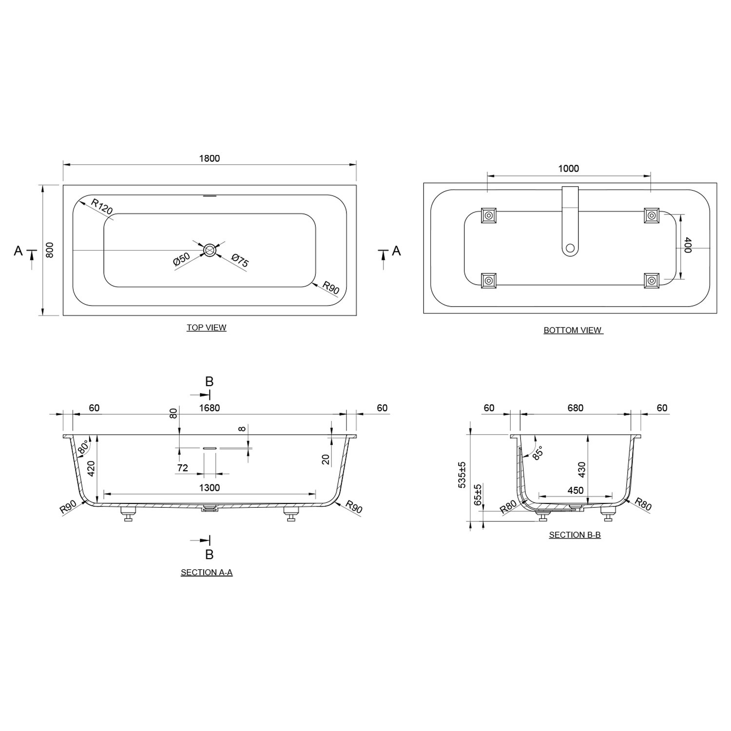 Het afvoergat van dit bad heeft een diameter van 5 cm en de overloop zit in het midden van de zijkant van het bad. Deze heeft een lengte van 8 cm met een hoogte van 0,8 cm.