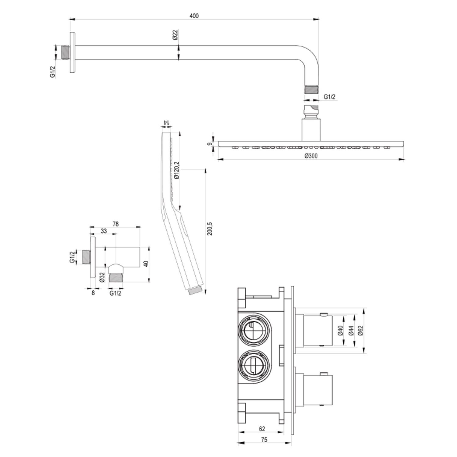 De set bestaat uit een inbouwthermostaat, een afbouw deel van de thermostaat kraan, een wandarm, een hoofddouche met een diameter van 30 cm, een handdouche inclusief wandarm en doucheslang. De thermostaatkraan, met 3/4'' aansluiting, is eenvoudig te bedienen door de twee knoppen. Met de onderste knop kunt u eenvoudig de temperatuur van het water instellen. De thermostaat beschikt over een kinderbeveiliging bij 38 graden, waardoor u nooit per ongeluk onder een kokend hete douche zat staan. met de bovenste knop bepaalt u de gewenste douchstand en kunt u switchen tussen de hoofd- en handdouche.