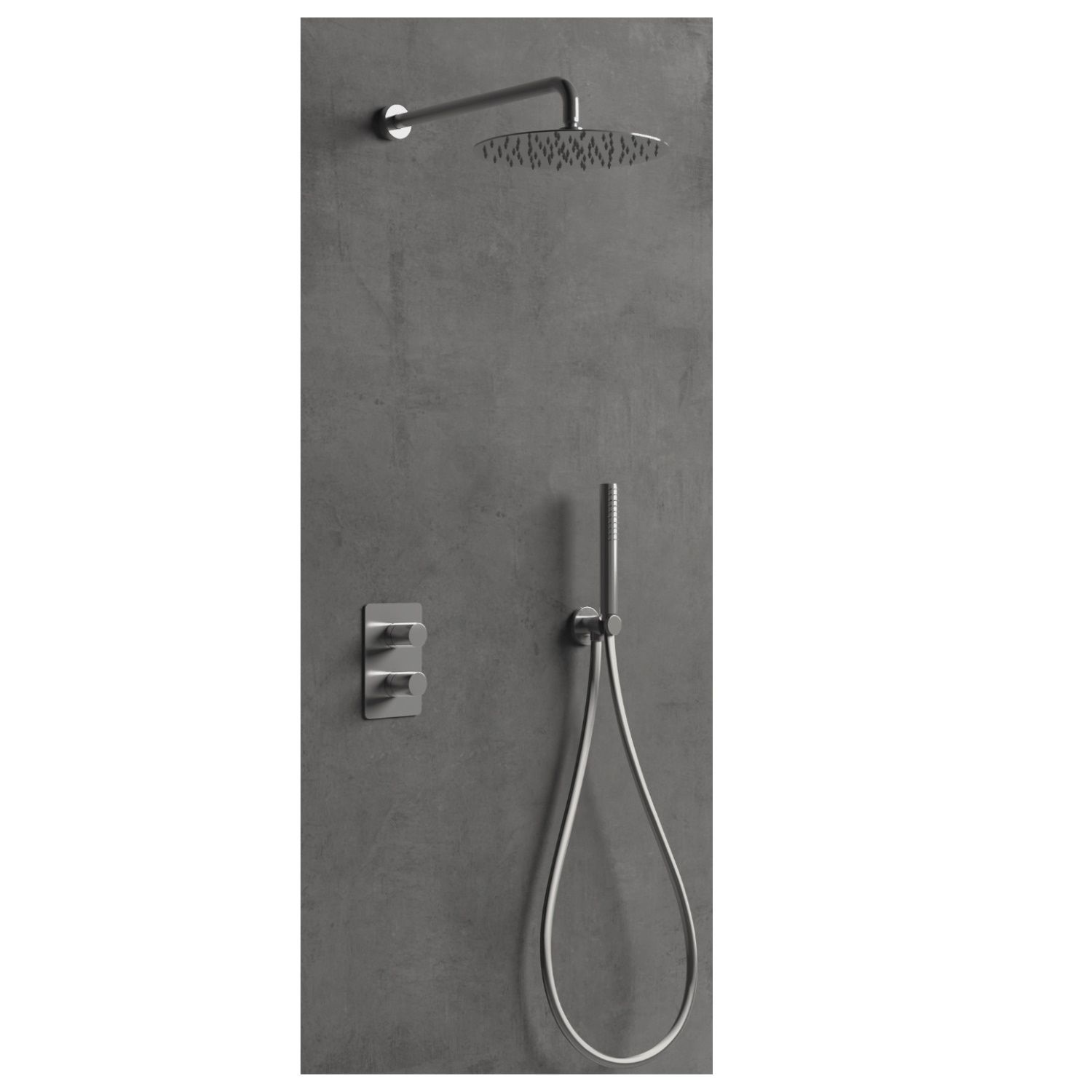 De thermostaatkraan wordt geleverd inclusief een bijpassend inbouwdeel. Houd er rekening mee dat de inbouwdiepte van de thermostatische inbouwkraan 72 mm bedraagt. De kraan is verder voorzien van een omstelknop waarmee u eenvoudig switcht tussen de regendouche en de handdouche. De handdouche is staafvormig en bevestigt u op de doucheslang met een lengte van 150 cm. De handdouche bewaart u in de standaard meegeleverde handdouchehouder.