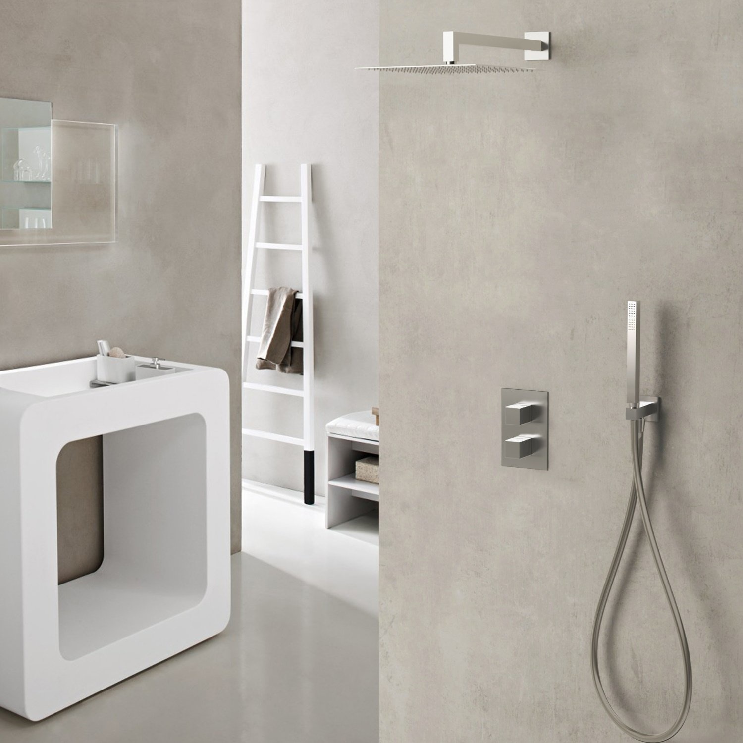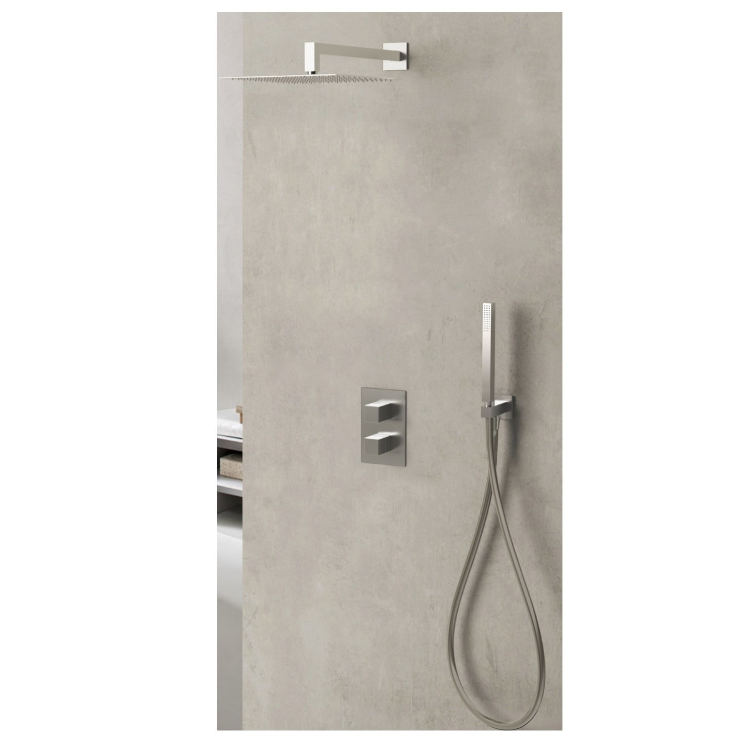 De Giulini regendoucheset is van het merk Sanimex Design en staat garant voor een hoogwaardige kwaliteit en design. De regendoucheset bestaat uit een wanduitloop, een vierkante hoofddouche, een inbouw thermostaatkraan en een handdoucheset. De elementen uit deze inbouw regendoucheset zijn afgewerkt in een glanzend chromen kleur en zijn gemaakt van messing. Doordat deze artikelen van messing gemaakt zijn is de set uitstekend tegen vocht bestand en is een lange levensduur gegarandeerd.