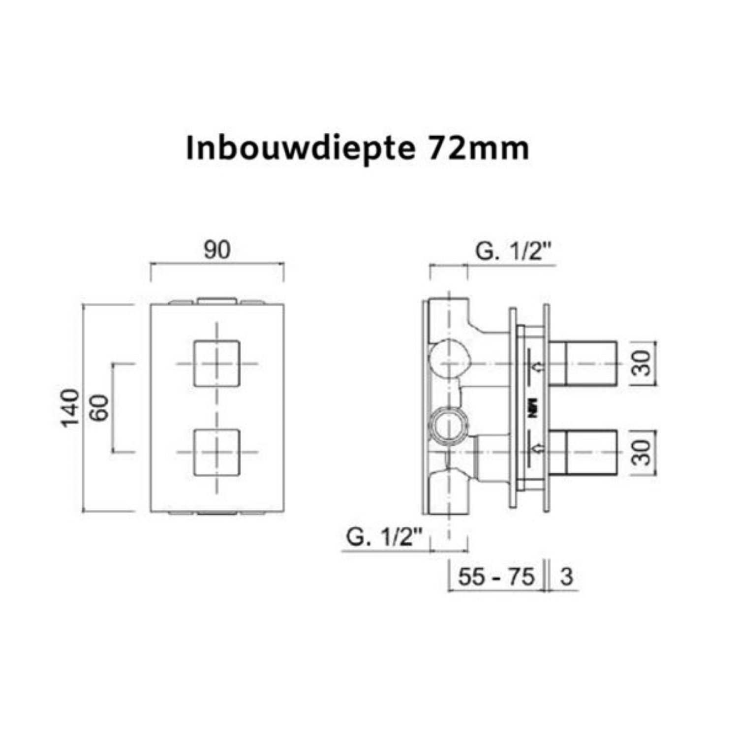 De thermostaatkraan wordt geleverd inclusief een bijpassend inbouwdeel. Houd er rekening mee dat de inbouwdiepte van de thermostatische inbouwkraan 72 mm bedraagt. De kraan is verder voorzien van een omstelknop waarmee u eenvoudig switcht tussen de regendouche en de handdouche. De handdouche is staafvormig en bevestigt u op de doucheslang met een lengte van 150 cm. De handdouche bewaart u in de standaard meegeleverde handdouchehouder.