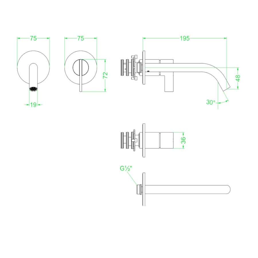 De wastafelkraan heeft een uitloop lengte van 19,5 cm en een uitloop hoogte van 4,8 cm. De kraan heeft een breedte van 7,5 cm en een diameter van 1,9 cm. De maat van de draadaansluiting is 1/2 inch.