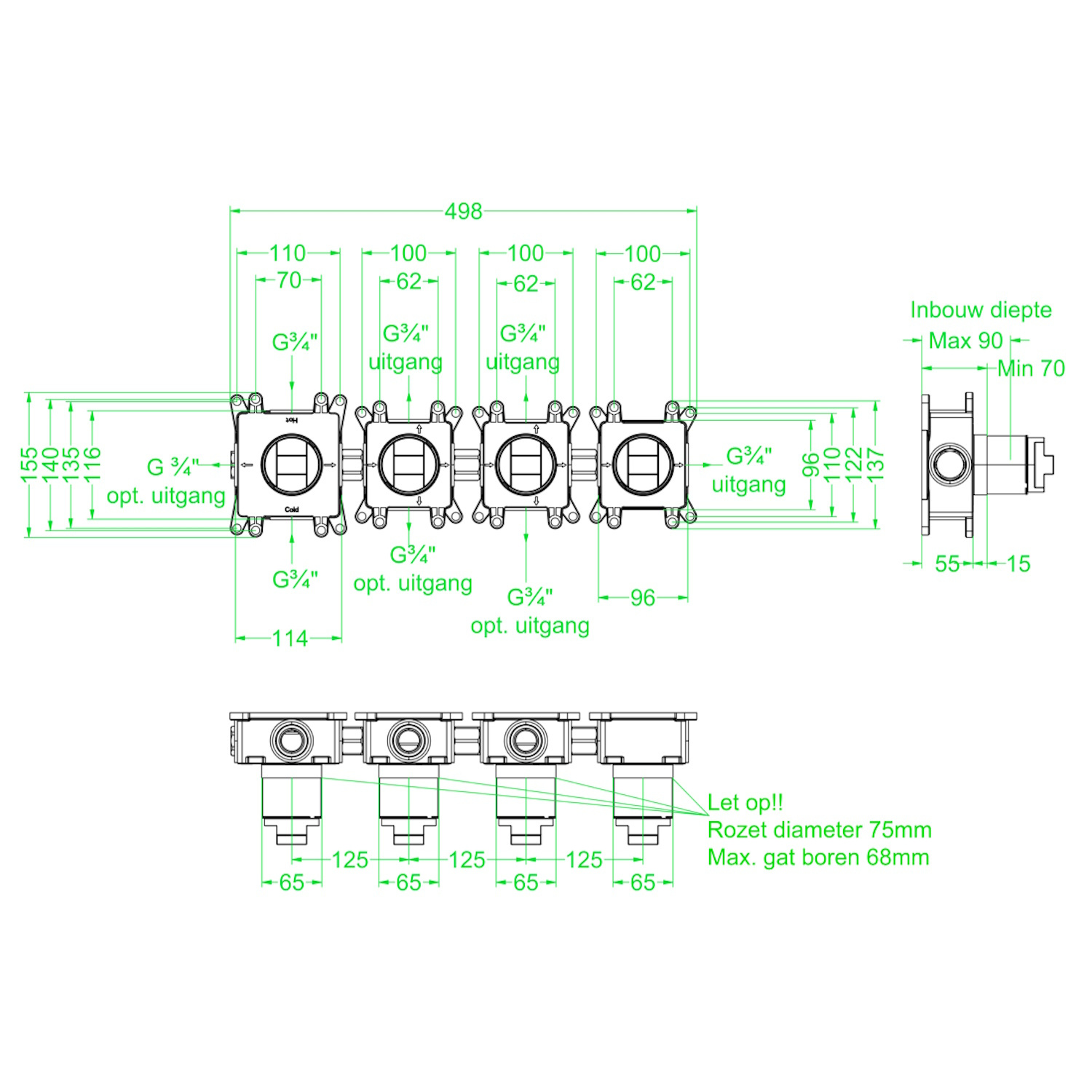 De inbouwboxen hebben een totale lengte van 49,8 cm en een hoogte van 11,6 cm. De inbouw diepte van de inbouwbox is minimaal 7 cm en maximaal 9 cm. De rozet heeft een diameter van 7,5. De maat draadaansluiting is 3/4 inch.