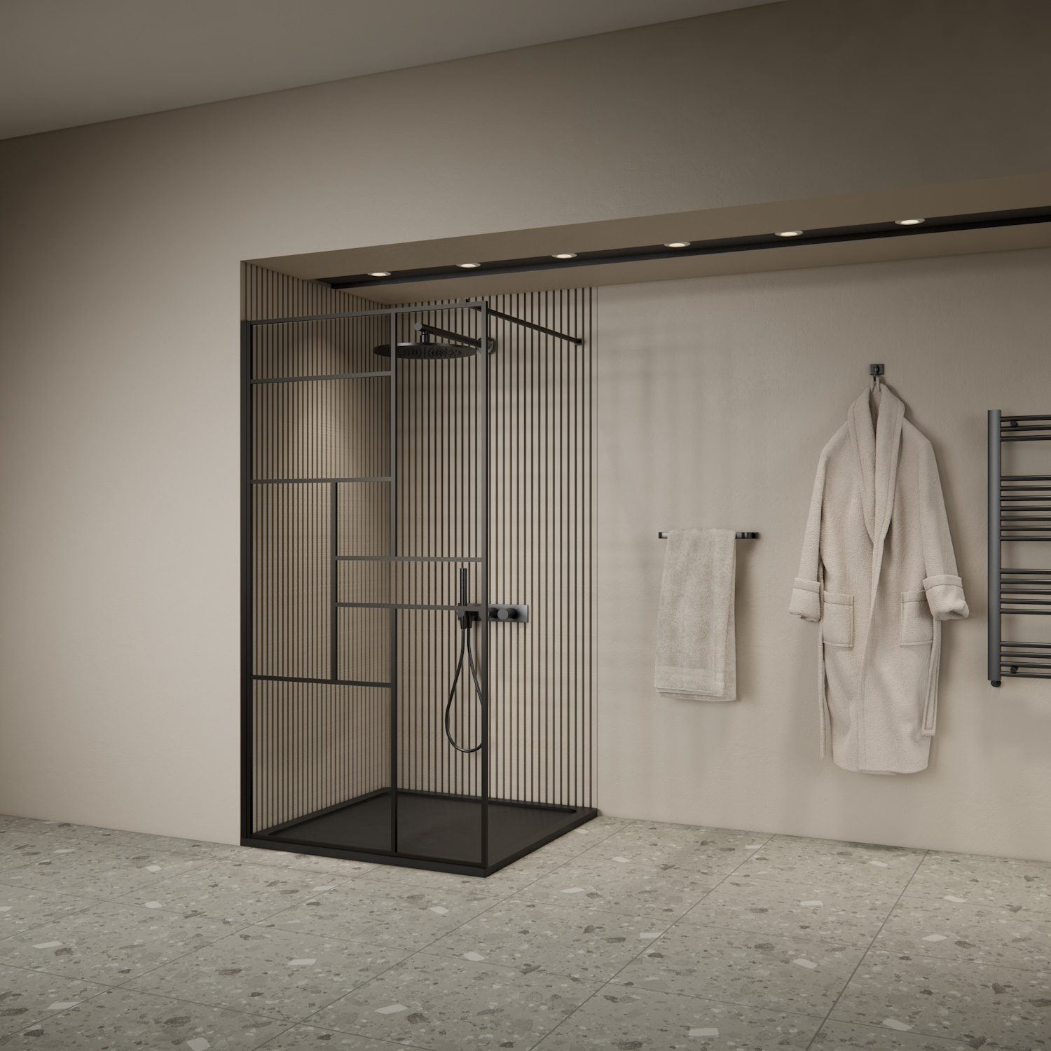 Moderne inloopdouche van Boss & Wessing uit de Airon serie past met zijn strakke design met zwarte profielen perfect in de moderne badkamer.