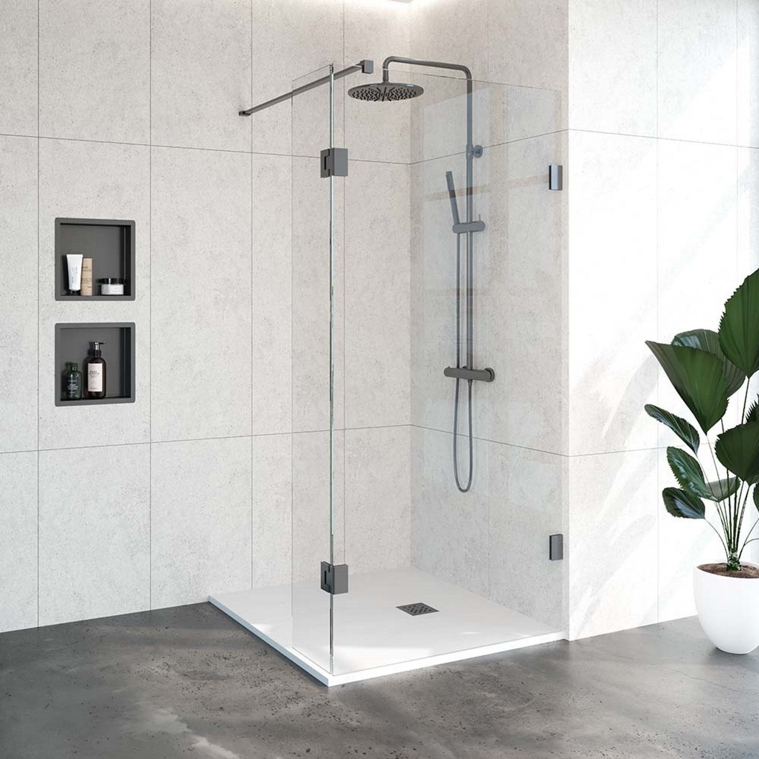 Deze complete inloopdouche bestaat uit een inloopwand en een draaibare zijwand met Gunmetal beslag. Inclusief glasbehandeling en optionele kunststof profielen. De hoogte van de inloopdouche is 200 cm. Hij is 97,7 cm breed en maximaal 200 cm diep. Deze inloopdouche straalt luxe uit door zijn design en kleur.