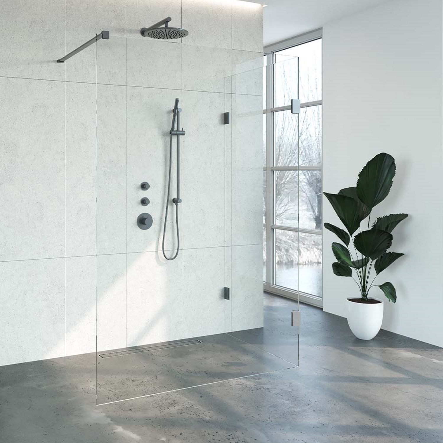 Deze complete inloopdouche bestaat uit twee inloopwanden met Gunmetal beslag. Inclusief glasbehandeling. De hoogte van de inloopdouche is 200 cm. Hij is 138,3 cm breed en 87,7 cm diep. Deze inloopdouche straalt luxe uit door zijn design en kleur.