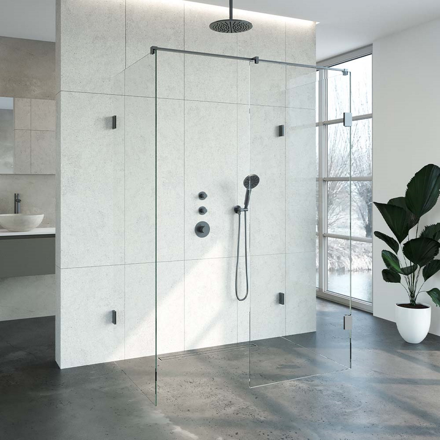 Deze complete inloopdouche bestaat uit twee inloopwanden van 90 cm en één van 77,5 cm. Inclusief glasbehandeling. De hoogte van de inloopdouche is 200 cm. Hij is 139,1 cm breed en 87,7 cm diep. Deze inloopdouche straalt luxe uit door zijn design en kleur.