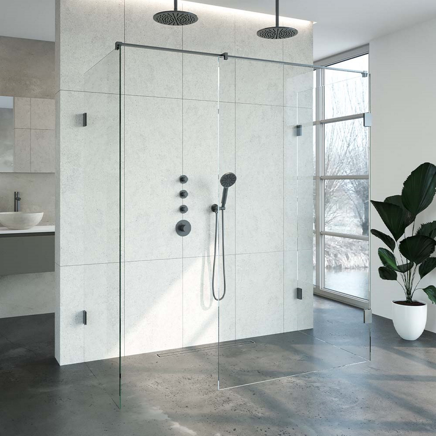Deze complete inloopdouche bestaat uit twee inloopwanden van 90 cm en één van 117,5 cm. Inclusief glasbehandeling. De hoogte van de inloopdouche is 200 cm. Hij is 179,1 cm breed en 87,7 cm diep. Deze inloopdouche straalt luxe uit door zijn design en kleur.