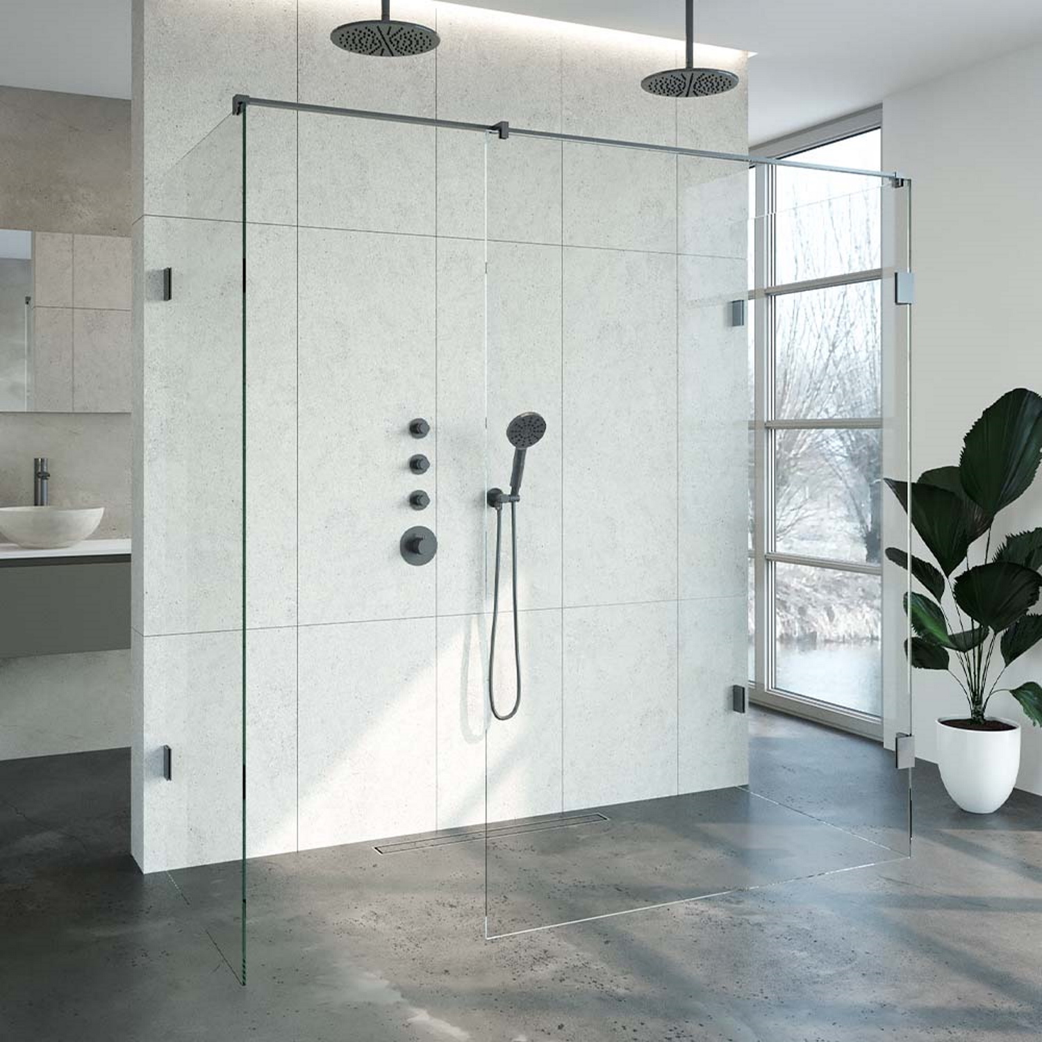 Deze complete inloopdouche bestaat uit twee inloopwanden van 90 cm en één van 137,5 cm. Inclusief glasbehandeling. De hoogte van de inloopdouche is 200 cm. Hij is 199,1 cm breed en 87,7 cm diep. Deze inloopdouche straalt luxe uit door zijn design en kleur.
