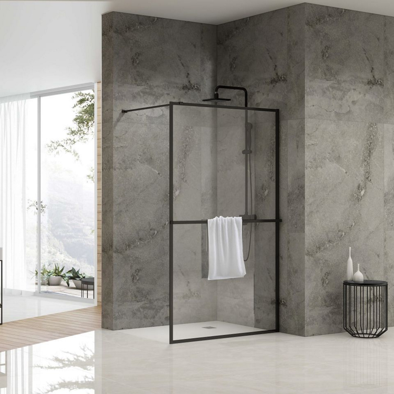 De inloopdouche is voorzien van een aluminium omkaderd profiel met een zwarte afwerking en helder glas van 8 mm met glasbehandeling. De douchewand blijft stevig staan mede dankzij de zwarte stabilisatiestang met een lengte van 120 cm. De stabilisatiestang is gemaakt van roestvrij staal en wordt standaard met de douchewand meegeleverd. De inloopdouche heeft geen vloerbevestiging, waardoor u de wand na het plaatsen transparant kunt afkitten.