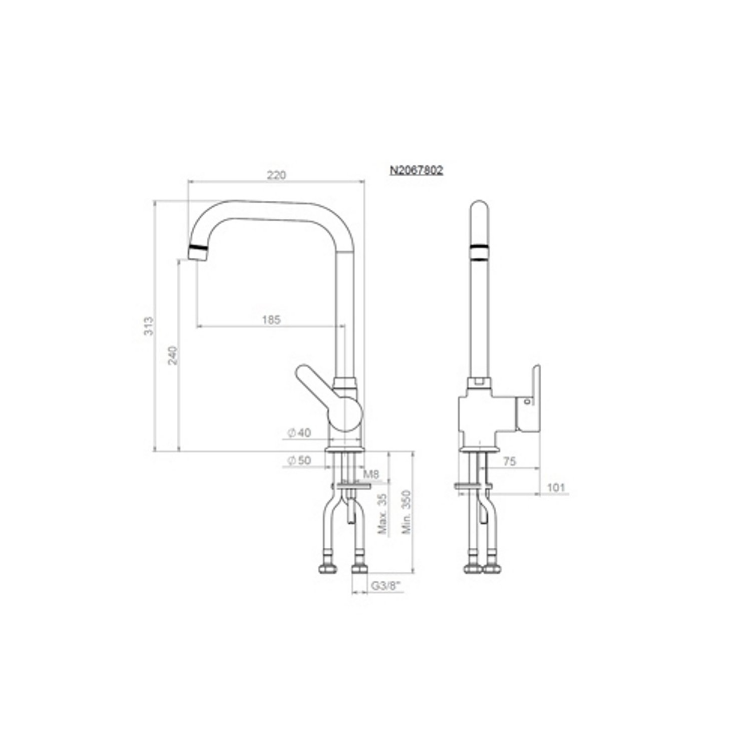 Keukenmengkraan Voda van Plieger met hoge uitloop geeft uw wasbak een moderne uitstraling. De kraan is 31,3 cm hoog, 10,1 cm breed en 22 cm diep. De uitloop is 24 cm hoog en 18,5 lang. Hij is van messing met een mooie glanzende chroom kleur.
