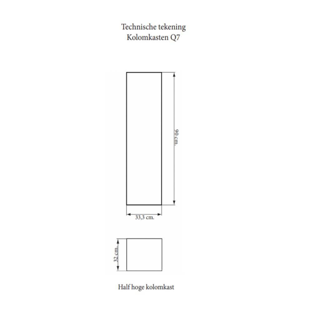 De kolomkast heeft een hoogte van 90 cm, een breedte van 33,5 cm en een diepte van 32 cm. De kast valt perfect te combineren met andere producten uit de Q15-serie van Sanicare. De kolomkast is afgewerkt in de kleur antraciet.