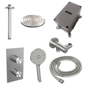 Regendoucheset Inbouw Brauer Brushed Carving Thermostatisch 20cm met 3-Weg Omstelling, Plafondarm en 3-Standen Handdouche Geborsteld RVS