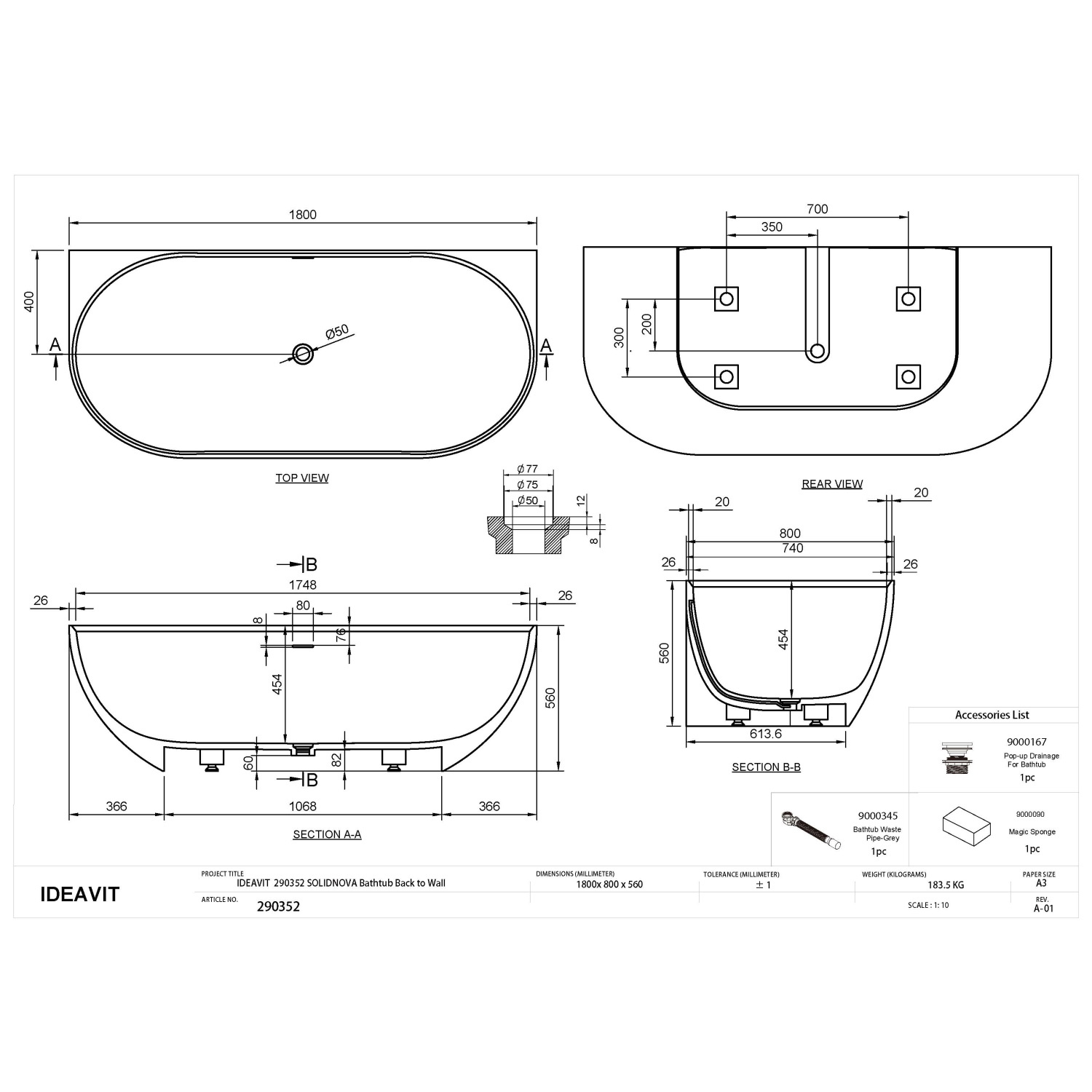 Geniet van een heerlijk spa moment met het SolidNova bad van Ideavit. Dit Back-to-Wall is gemaakt van Solid Surface en heeft een mat witte afwerking. De elegante ovale vorm van het bad is ideaal in alle eigentijdse badkamers. Het bad is half vrijstaand en wordt met één kant tegen de muur geplaatst. De moderne vorm en royale afmetingen geven een welzijn gevoel in uw badkamer. Het bad heeft een afmeting van 180 cm lang, 80 cm breed en 56 cm hoog. De pop-up afvoer heeft dezelfde mat witte, Solid Surface cover en is inbegrepen bij het bad. Het bad heeft een overloop. Tevens is de afvoerpijp inbegrepen.