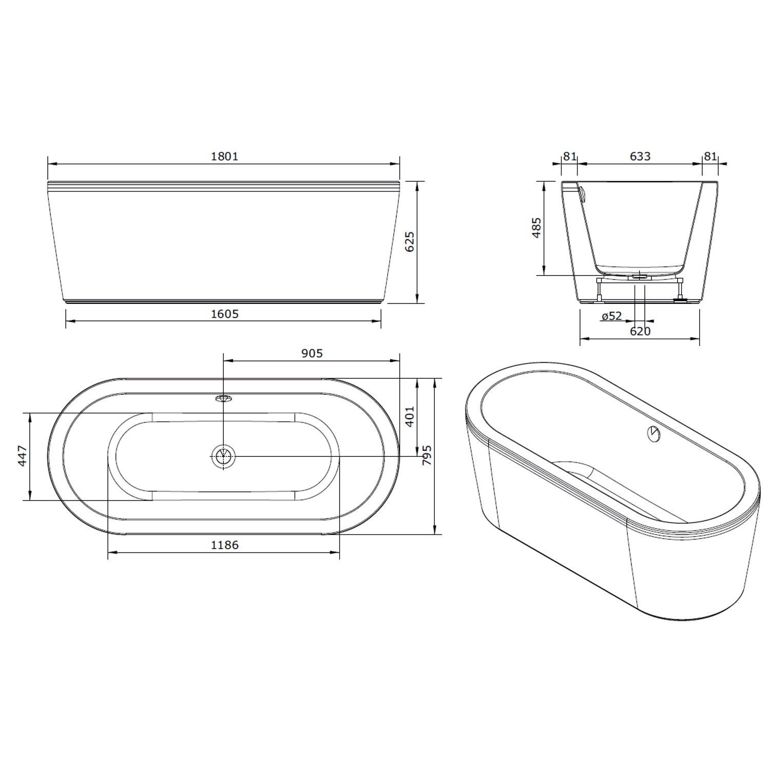 Het bad is 180 cm lang en 80 cm breed en heeft een binnenmaat van op zijn smalst 160.5 cm lang, 63.3 cm breed en 48.5 cm hoog. Het afvoergat is 5.2 cm in diameter.