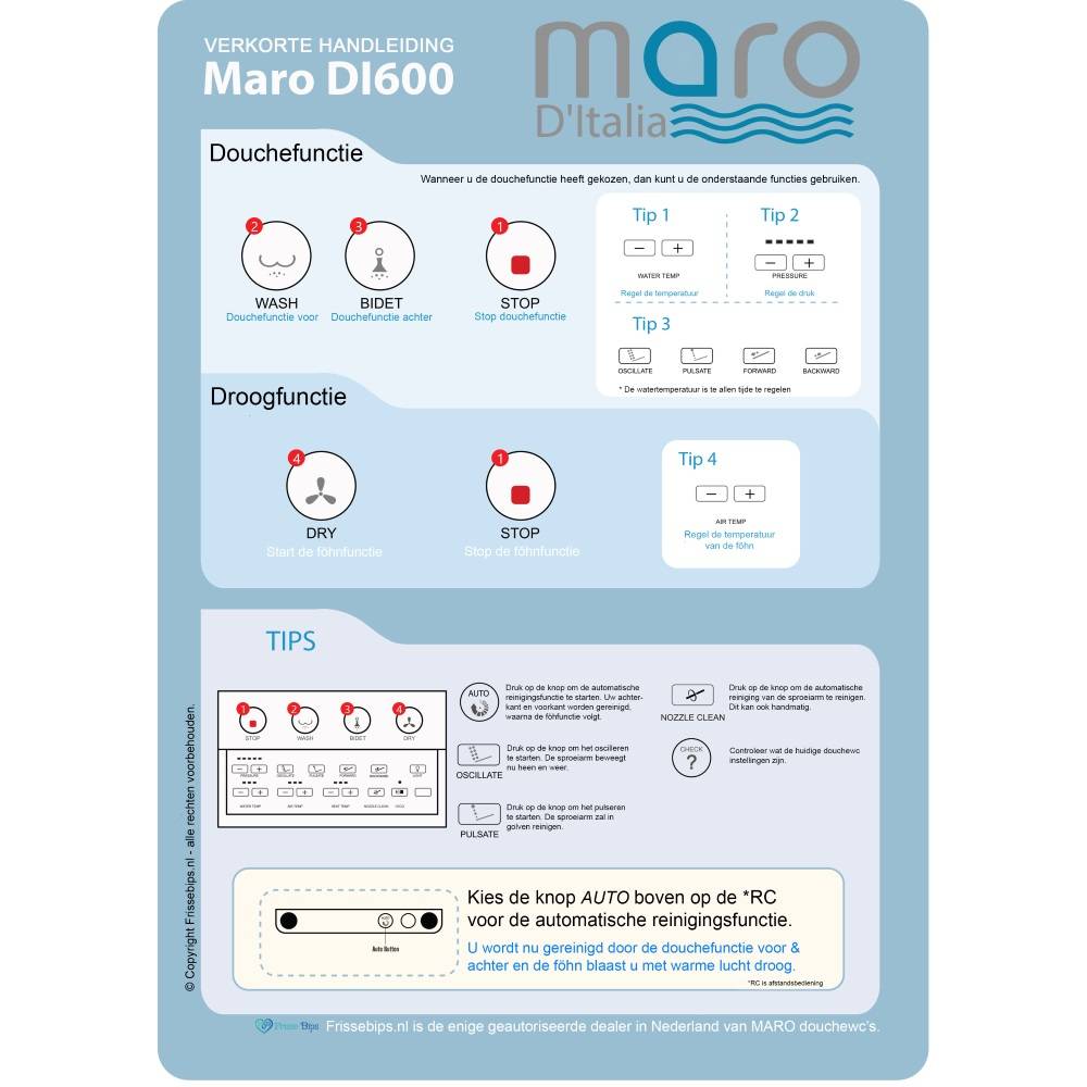 De Maro D'Italia DI600 douchewc is de nieuwste compromisloze douche wc dat halverwege 2014 is geïntroduceerd. De Maro D'Italia DI600 bidet toilet heeft een volmaakt modern design en is geproduceerd met hoogwaardige en duurzame materialen. Het douchetoilet van Maro heeft geavanceerde functies die u optimaal comfort en een gevoel van hygiëne geven. De Maro DI600 bidetbril heeft een klassiek design en door het slimme ontwerp past deze douchewc op 93% van de Nederlandse toiletpotten. In tegenstelling tot de eerdere modellen, is de elektrische aansluiting van de Maro D'Italia DI600 douchewc in het midden van de achterkant gemonteerd, zodat de aansluiting zowel links als rechts eenvoudig is te monteren. De bidetbril is van extra stevig materiaal gemaakt en heeft een sproeier die zowel oscilleert als pulseert, voor een comfortabele reiniging.