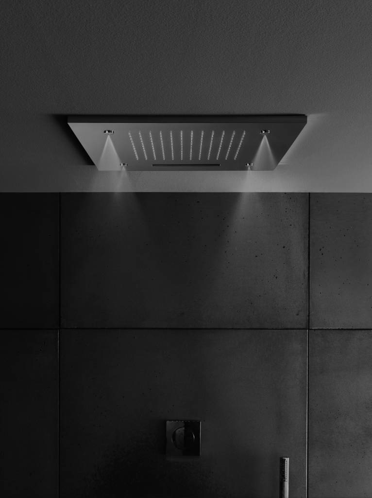 Vierkante inbouw hoofddouche van 50 bij 50 cm, vervaardigd uit messing, chroom of geborsteld nikkel. Deze hoofddouche beschikt over een waterval en een nevel functie. Net als vele andere hoofddouches van Hotbath beschikt dit product over het waterbesparende Shower Power System.