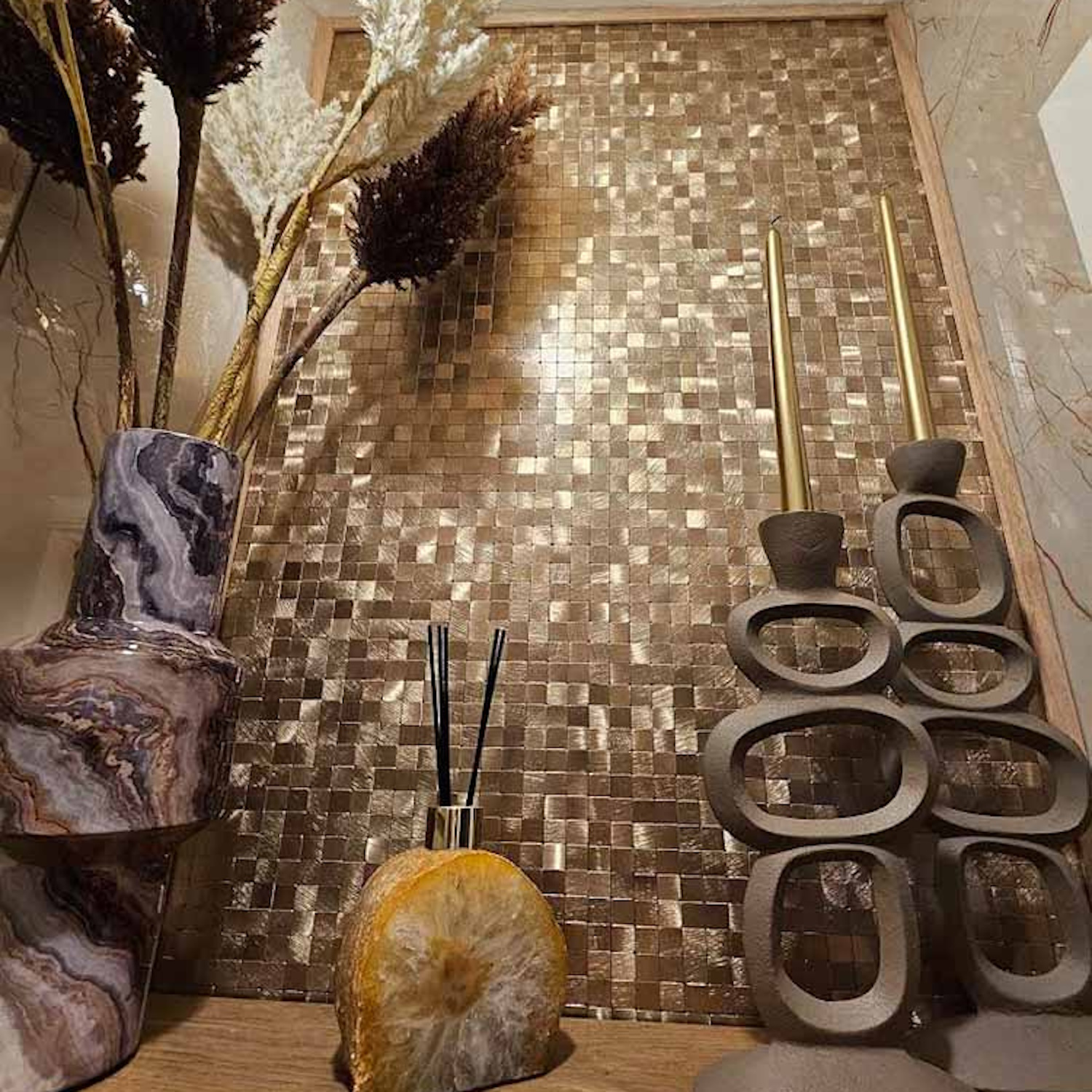 Geef uw ruimte gemakkelijk een nieuw uiterlijk met de zelfklevende mozaïek tegels van Isodeco. Deze tegelmatten hebben een afmeting van 30,5x30,5 cm en zijn 4 mm dik. De tegel bestaat uit kleine vierkante blokjes met een metallic uiterlijk. De blokjes bevatten goud bruine tinten en zijn geschikt voor op de wand.