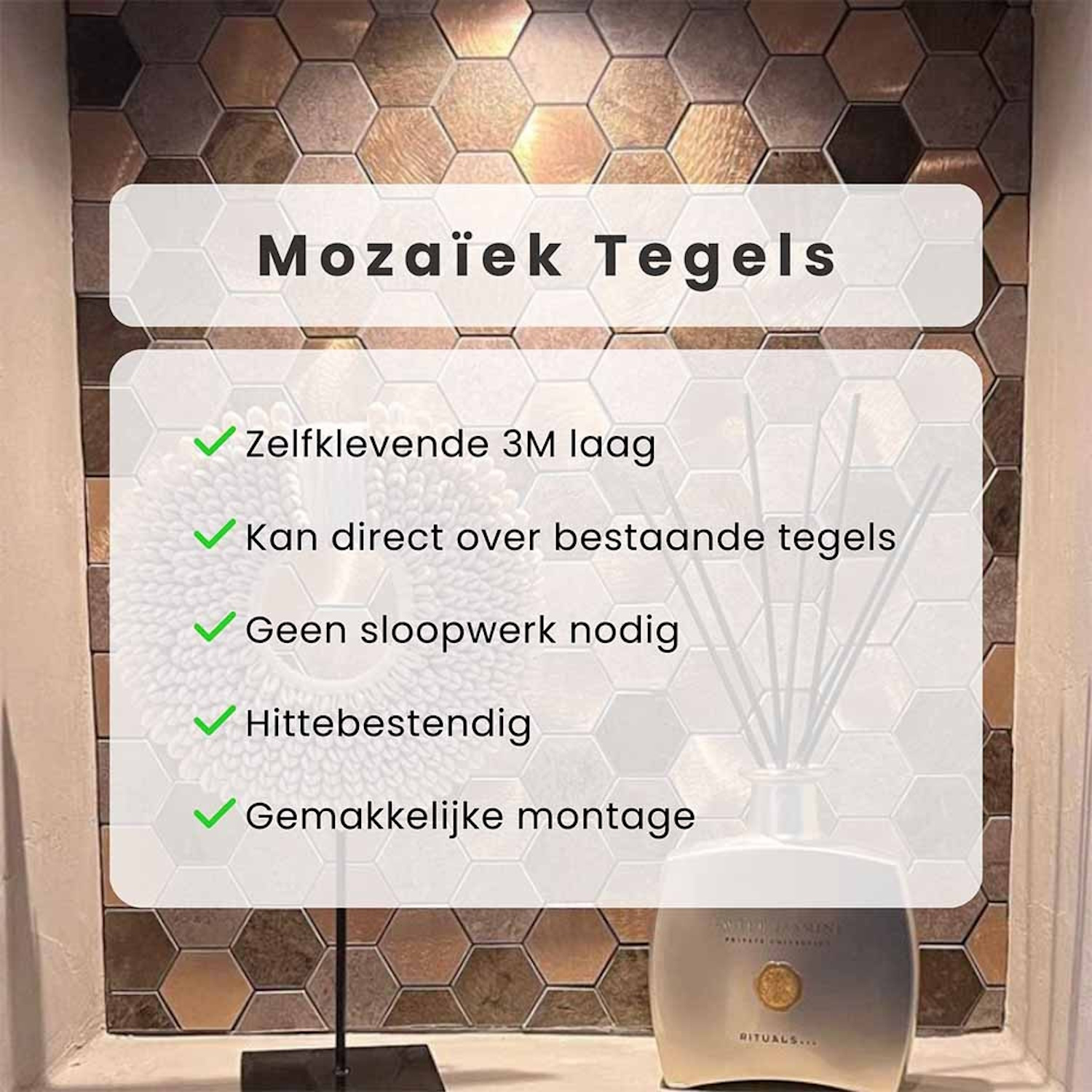 De tegels zijn geschikt voor elke binnenruimte en zijn kras-, stoot- en slijtvast. Als u de tegels in uw keuken wilt gebruiken, hou dan minimaal 10 cm afstand van het gasfornuis. Dankzij de sterke 3M kleeflaag wordt betegelen makkelijker dan ooit! U kunt de tegels zelfs over uw bestaande tegels plakken! Bij kalkmuren, spachterputz of granol raden we u aan extra montagekit te gebruikten.
