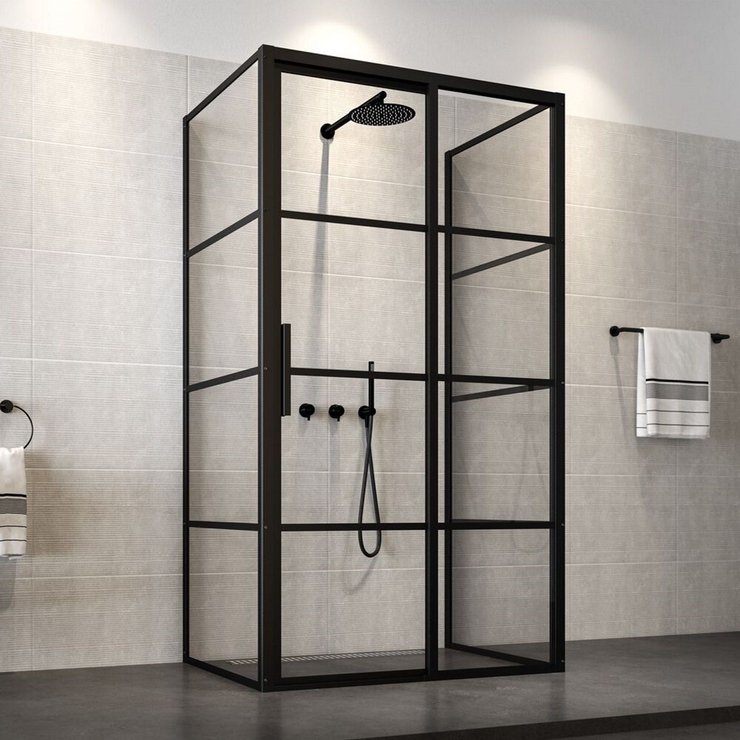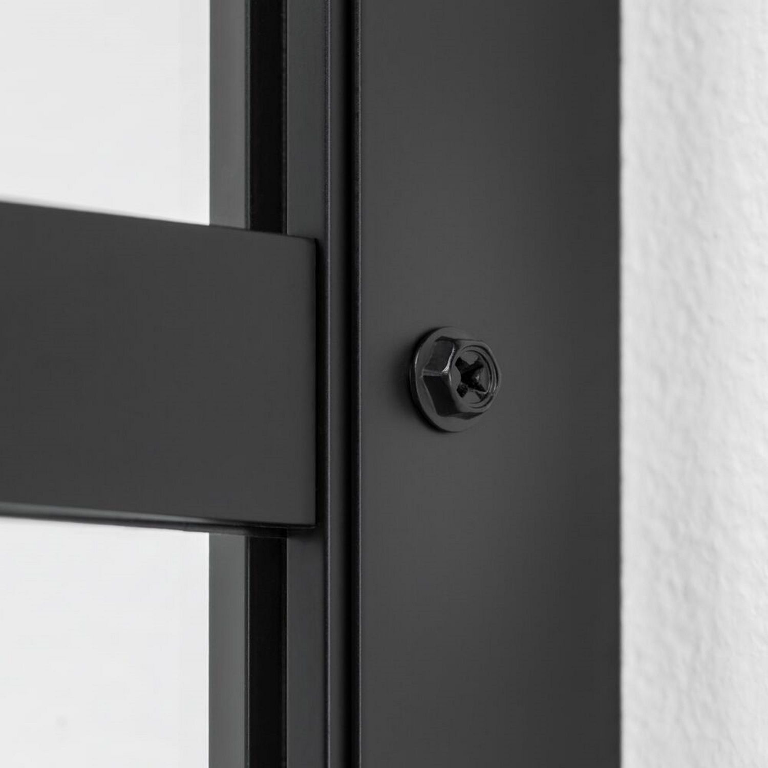 Moderne deuren met een duidelijke knipoog naar de rauwe inspiratie. De zwarte metalen frames zijn gebaseerd op industriële deuren. Nu natuurlijk alleen aan de buitenzijde toegepast, zodat de douche van binnen eenvoudig te onderhouden is. Maar ook de subtiel toegepaste zichtbare bouten zijn een knipoog naar de oorsprong.