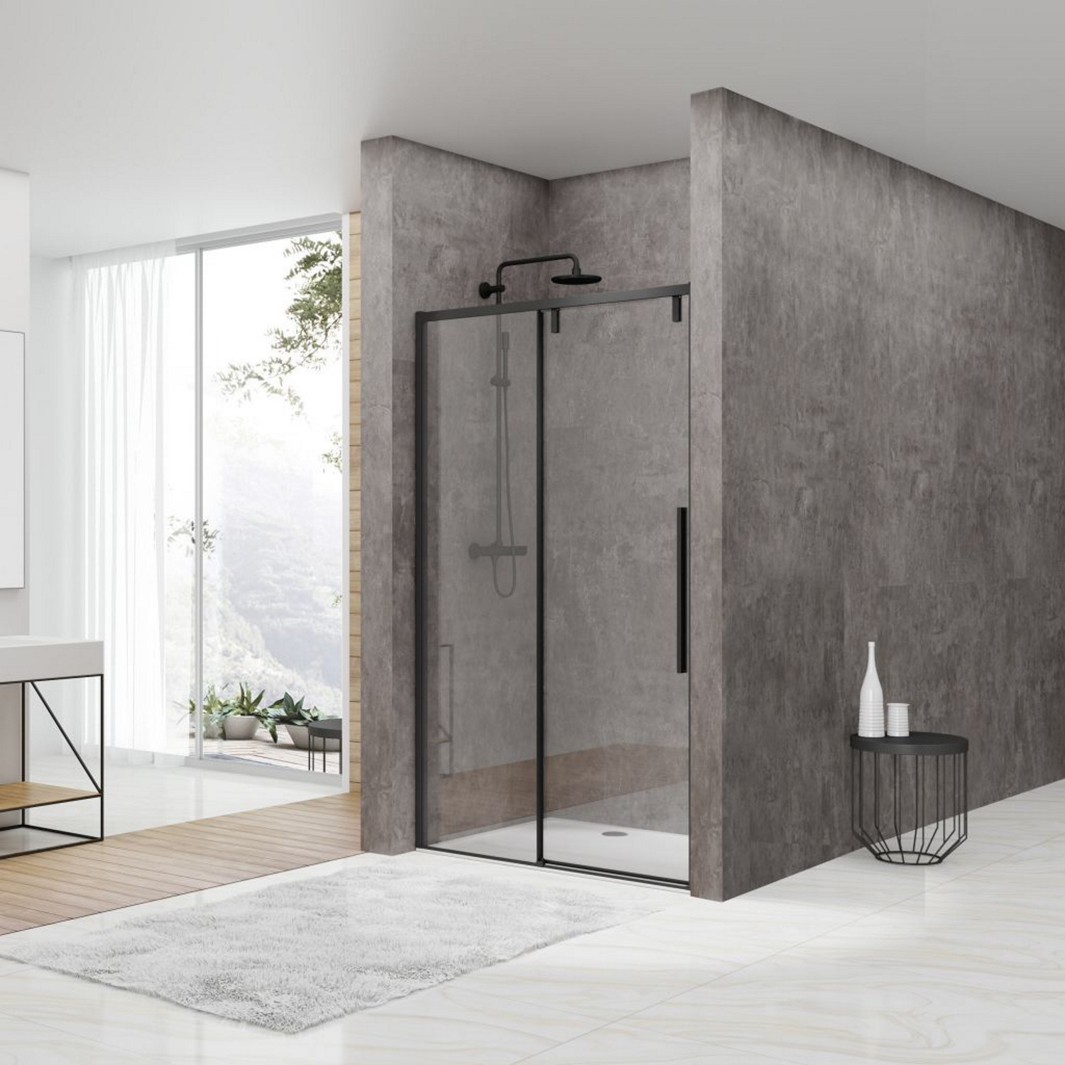 De Van Rijn nisdeuren zijn geschikt voor bijna iedere badkamer. De nisdeuren hebben een modern, strak design en zijn een absolute trend. Deze nisdeur is voorzien van een aluminium profiel, roestvrij stalen grepen en het bevat een zwarte afwerking. De schuifdeur wordt inclusief vaste wand geleverd.